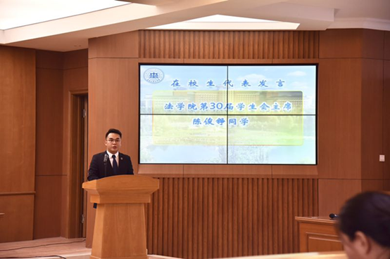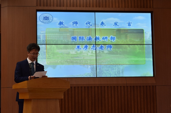 接下来是2019年“我最喜爱的教师”颁奖。共有王彦志,艾琳,孙良国,李拥军,李海平,何志鹏,郑军男,赵海乐,姚莹,曹险峰十位教师获此殊荣。王彦志老师作为教师代表进行发言,他向同学们表达了美好的祝福,希望大家都能“做一个善良纯真的法律人,像法律人那样思考,诗意地栖居在大地上。”