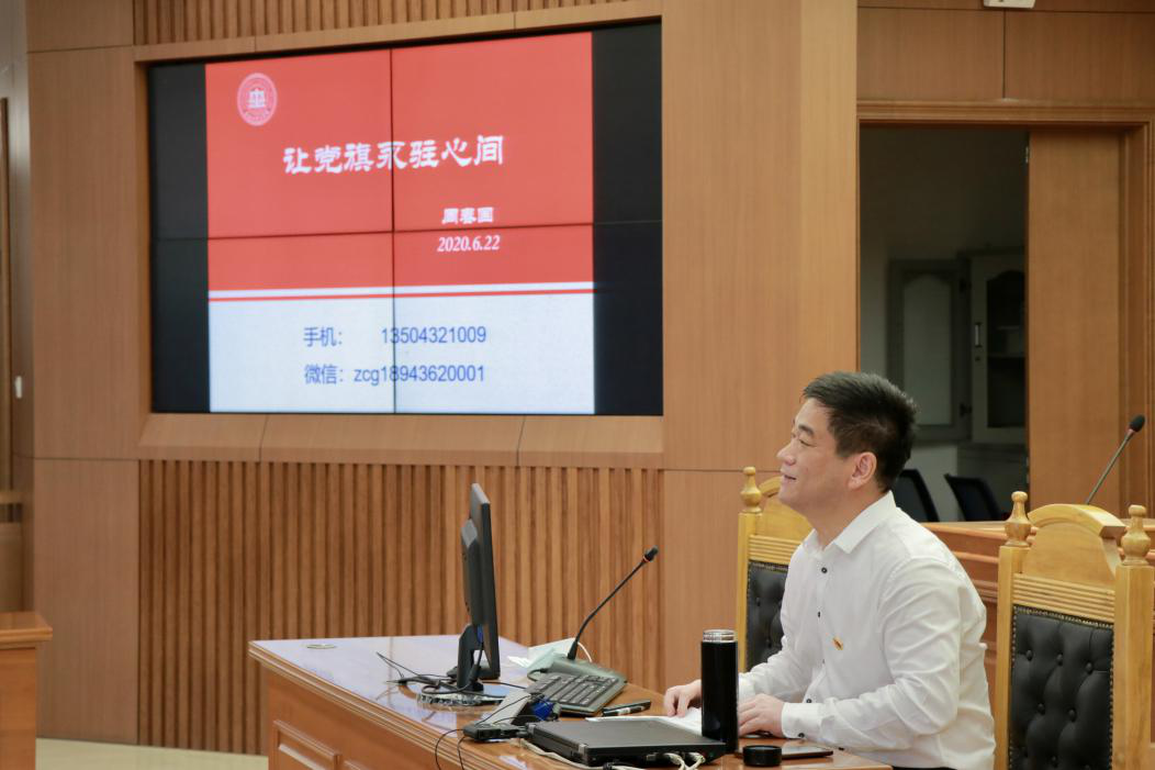 春国“让党旗永驻心间”为题,从疫情让世界认识中国和中国共产党为切入点“站位新时代,涵养政治视野”、“立足新起点,涵养政治品格“担当新使命,涵养政治定力”三方面,阐明了中国特色社会主义的制度优势和文化优势,勉励毕业生党员要涵养胸怀天下的气度、坚韧不屈的风骨、自信从容的风度、辩证思考的智慧和敢于担当的勇气,做公平正义的捍卫者、廉洁自律的表率者、保持警惕的清醒者,鼓励员工担起使命与责任,毕业后不能放松政治进步和业务学习。同时,周春国表达了对同学们的殷切期望,希望同学们在以后的人生道路中,以习近平新时代中国特色社会主义思想为指导,把自身的发展融入到民族复兴的伟大事业当中,矢志不渝,努力奋斗。