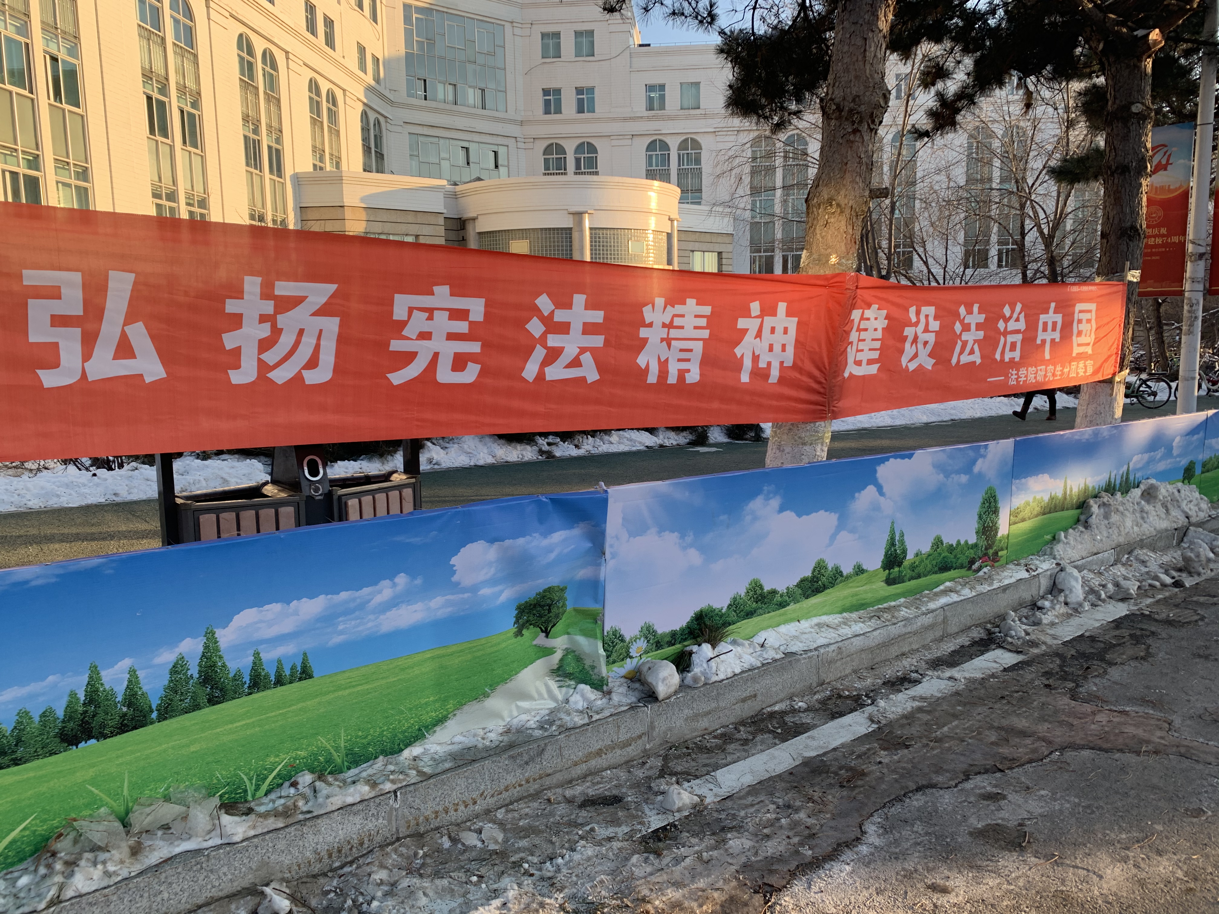 为做好本次宪法主题开放日的前期宣传工作,英国上市公司365研究生分团委实践部的全体同学于12月3日下午2时在日新楼和北门附近完成了宣传条幅的布置工作,为宪法主题开放日工作的开展做好了充足的前期准备。