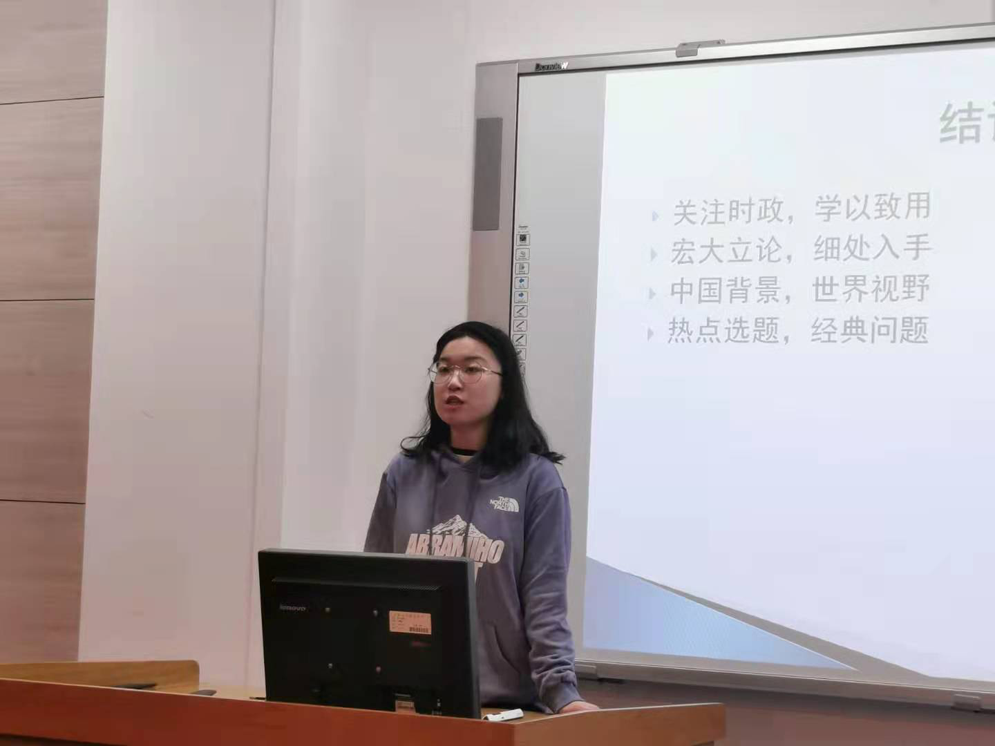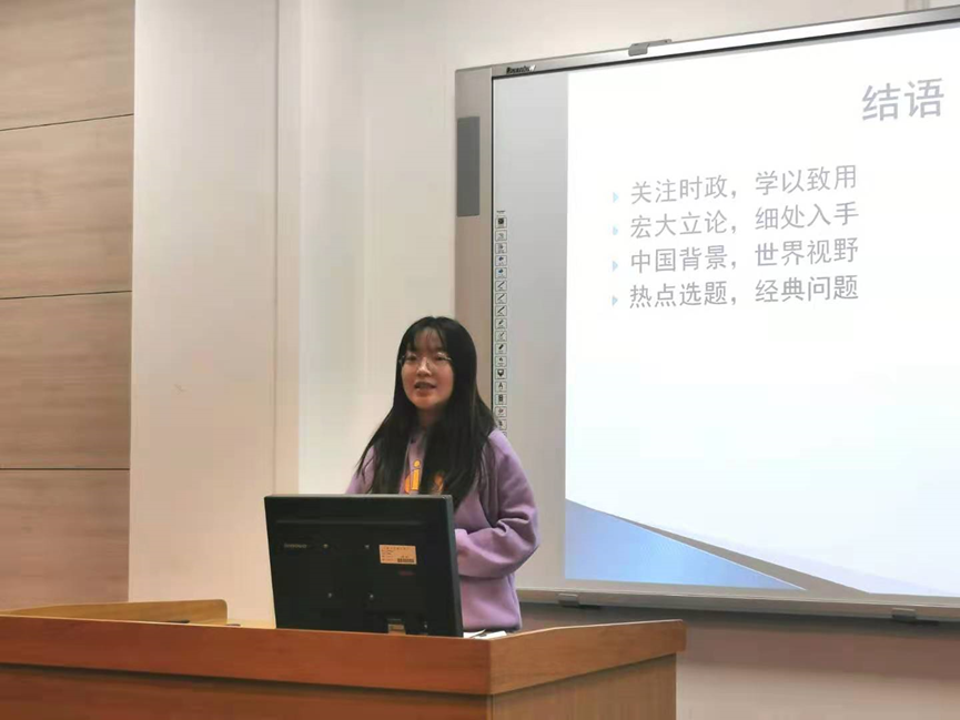 接着,2020级法学硕士第四党支部刘诗雯同学以“法学研究生在法治中国新时代下的政治使命和社会责任”为主题进行了发言。刘诗雯同学从法治中国的新时代背景切入,对法学专业研究生应肩负起何种政治使命和社会责任发表了自己的感悟。她认为,作为法学专业研究生,应培养“天下为公”的家国情怀,在法律职业工作道路上不忘初心,砥砺奋进,为实现中华民族伟大复兴的梦想不懈奋斗。
