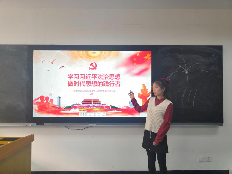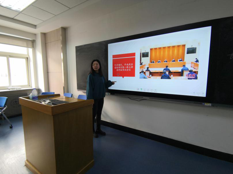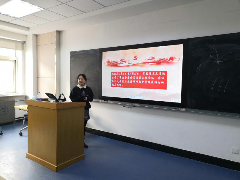 刘泓池同学发表了“以法为纲,崇法善治”的主题汇报。刘泓池同学指出,2020年11月16日至11月17日,党的历史上首次召开了中央全面依法治国工作会议,会议将习近平法治思想明确为全面依法治国的指导思想,这是一次里程碑意义的重大事件。她同时阐述了自己对“十一个坚持”的深刻理解,并且表达了自身立足当下,着眼长远的学习信心与决心。