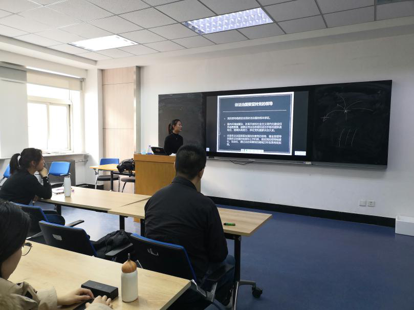 李鑫鑫同学以“以党为根,依法治国”为主题进行了发言。李鑫鑫同学从习近平总书记在中央全面依法治国工作会议上的讲话为切入点进行了分享。李鑫鑫同学认为,党的领导是推进全面依法治国的根本保证。国内环境越复杂,改革开放和社会主义现代化建设任务越是繁重,越要运用法治思维和法治手段巩固执政地位,提高执政能力,保证党和国家的长治久安。