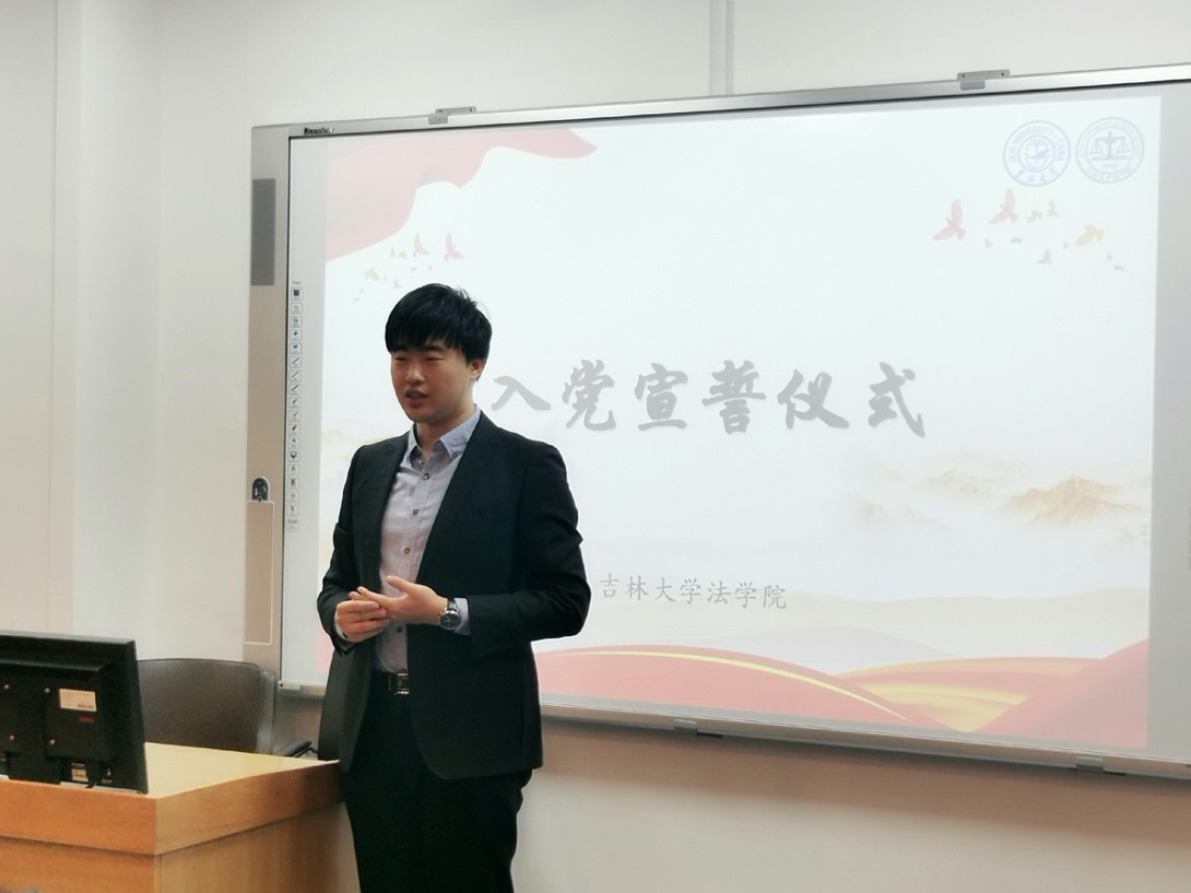 仪式开始,全体起立,奏唱国歌。随着庄严肃穆的国歌声结束,宣誓开始。新党员们在领誓人乔敬时同志的带领下举起右手,握拳,面对党旗,庄严宣誓。2018级法学硕士方进同志作为新党员代表发言。他代表新党员们承诺:将入党誓词作为自己终身的追求和实践,不忘初心,砥砺前行,做到无论在任何情况下都要保持好党员的先进性,发挥好党员的先锋模范作用。