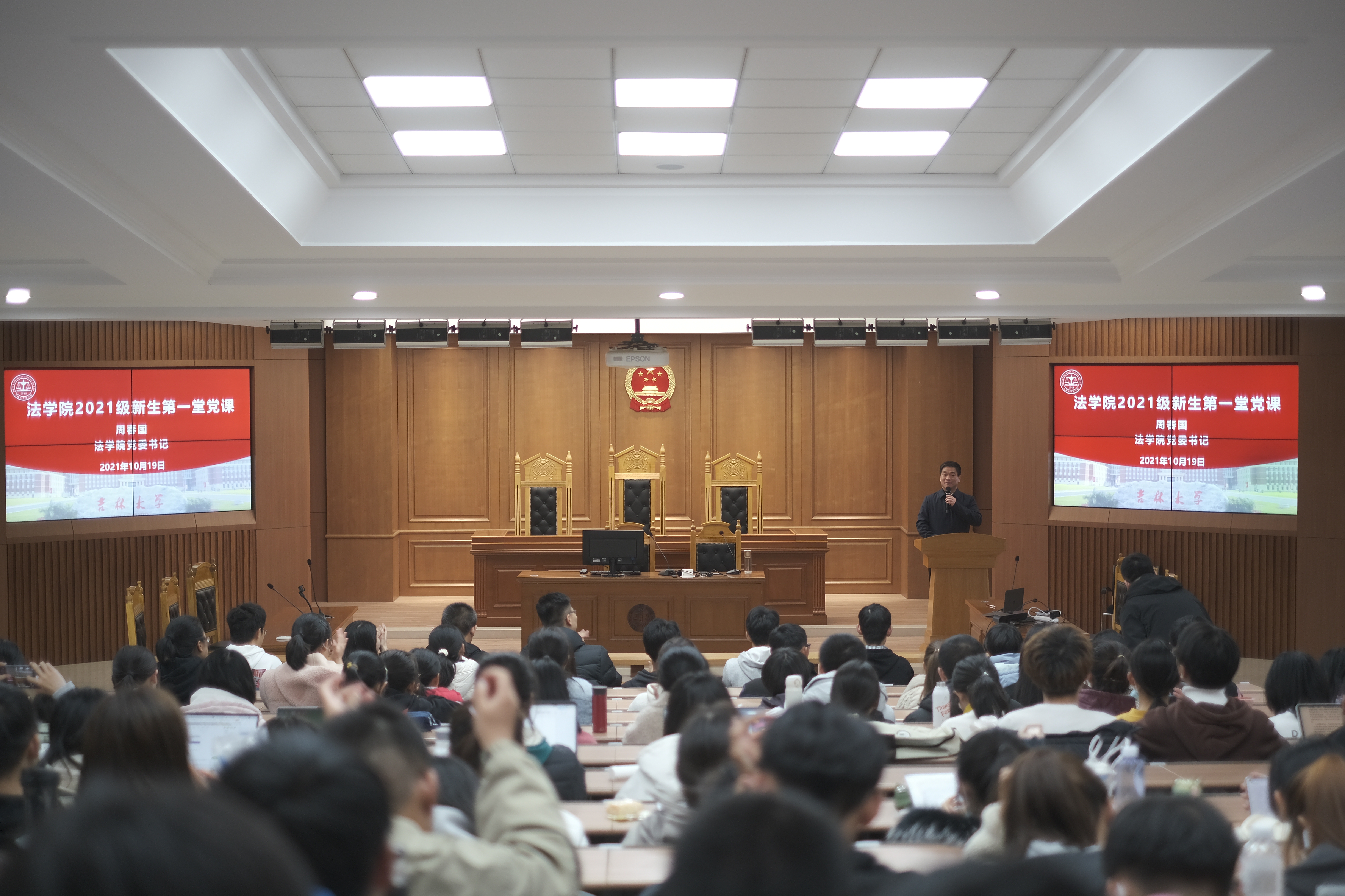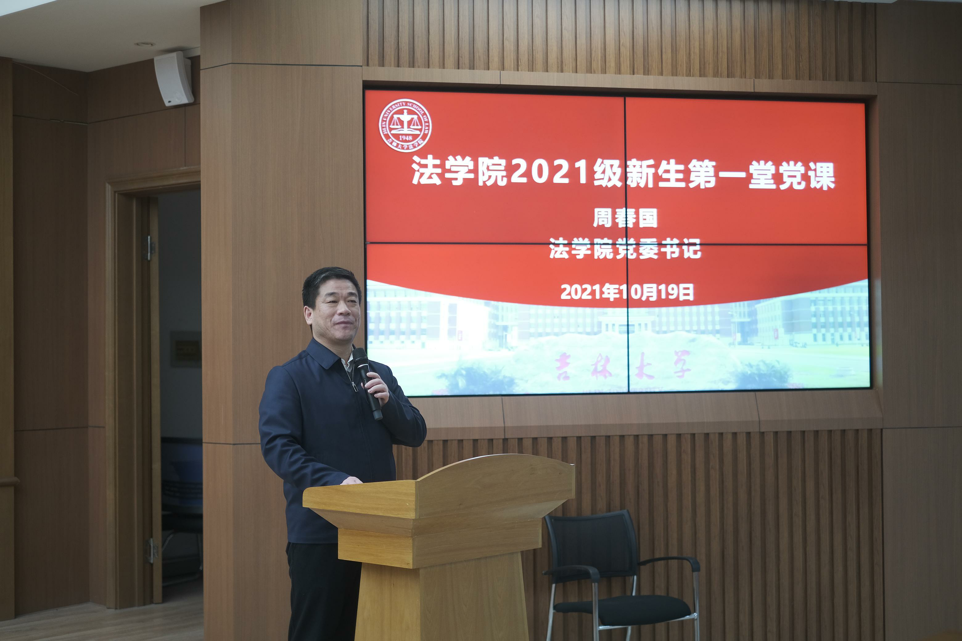 2021年10月19日18点30分,2021级新生在三教五阶迎来了第一堂情怀深厚、激荡人心的党课。法公司党委书记周春国以“明德笃行、隆法致公,做吉大法学精神的弘扬者”为题,引导新生树立爱党爱国意识,激励同学们培养开拓进取的理想信念,做勇担时代使命的吉大法学人。法公司党委副书记兼副经理林媛媛参加本次党课,课程由英国上市公司365团委书记、2021级辅导员赵昊骏主持。