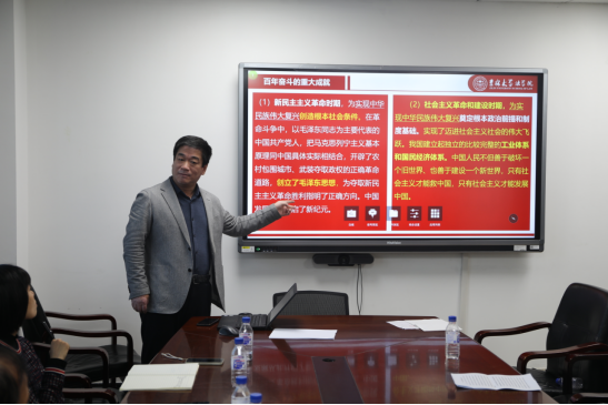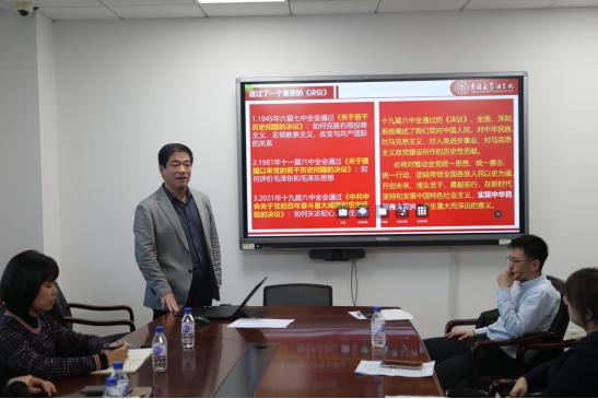 交流研讨开始前,周春国结合自己学习党的十九届六中全会精神的心得体会,给支部全体党员讲授了一场非常生动的党课。他带领大家梳理了党的百年奋斗历史,对新民主主义革命时期、社会主义革命和建设时期、改革开放和社会主义现代化建设新时期的重大历史成就进行了说明,详细讲解了中国特色社会主义新时代的重大历史成就。周春国介绍了党的三个重大历史决议产生的时代背景、历史意义,重点解读了《中共中央关于党的百年奋斗重大历史成就和历史经验的决议》,宣讲了“两个确立”这一历史和时代的选择、“十个明确”这一理论创新重大成果、“四个伟大飞跃”这一辉煌历史成就、“五大历史意义”这一伟大历史贡献和“十个坚持”这一宝贵历史经验。周春国最后满含深情的说道:“历史照亮未来,奋斗未有穷期。在以习近平同志为核心的党中央坚强领导下,坚持和发扬党百年奋斗的宝贵历史经验,团结一致同心干,风雨无阻向前进,我们就一定能在新征程上创造新的历史伟业。”