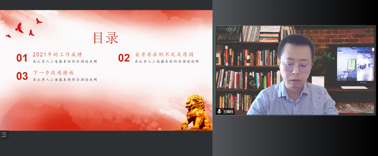 会上,4位教工党支部书记和7位员工党支部书记以“进一步贯彻落实习近平新时代中国特色社会主义思想,加强基层党建工作”为主题,结合各党支部特色,围绕党史学习教育系列活动的落实情况、履行基层党建第一责任人职责情况、党建工作与教学深度融合情况、落实立德树人根本任务情况、“新时代e支部”建设情况和疫情防控等几个方面对2021年度工作开展的做法与成效进行汇报,同时,检视存在的问题与原因,规划下一步的举措与目标。述职内容详实,条理清晰,图文并茂,展现出求真务实的工作作风。