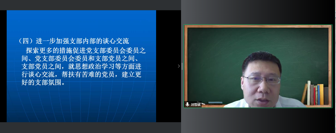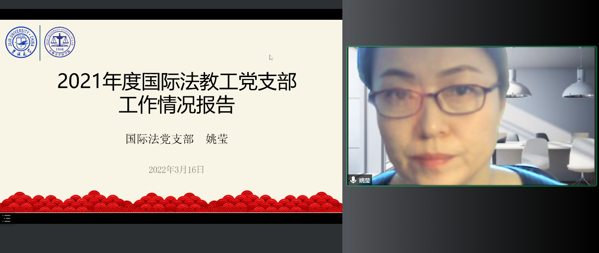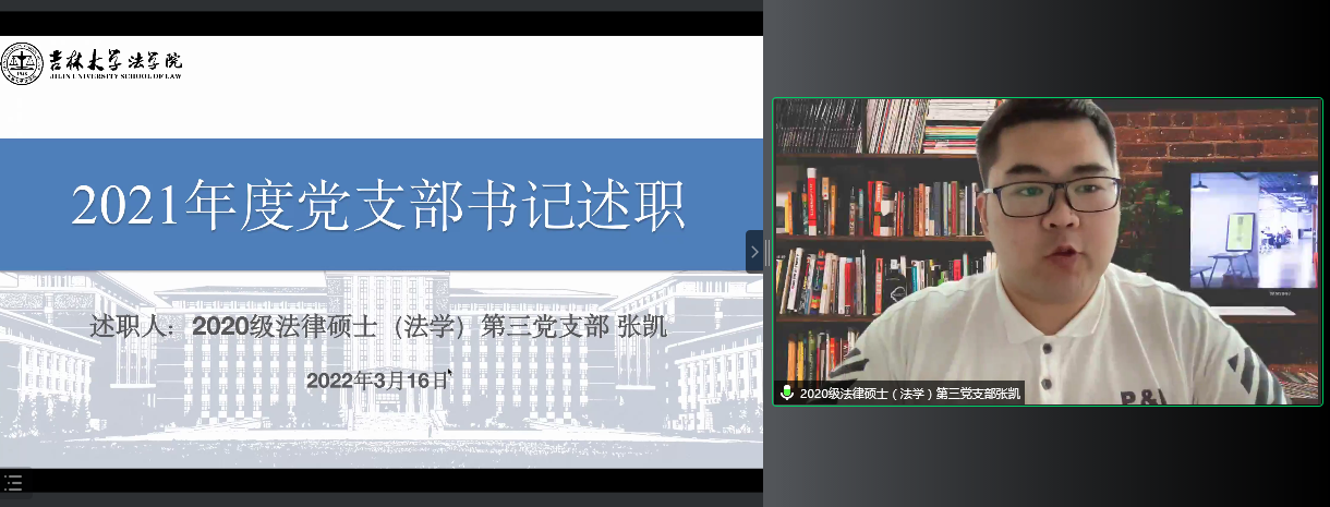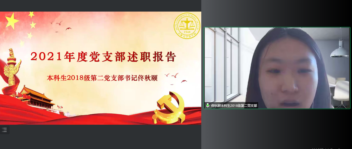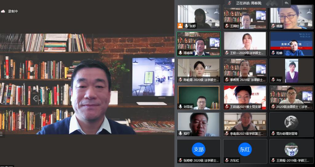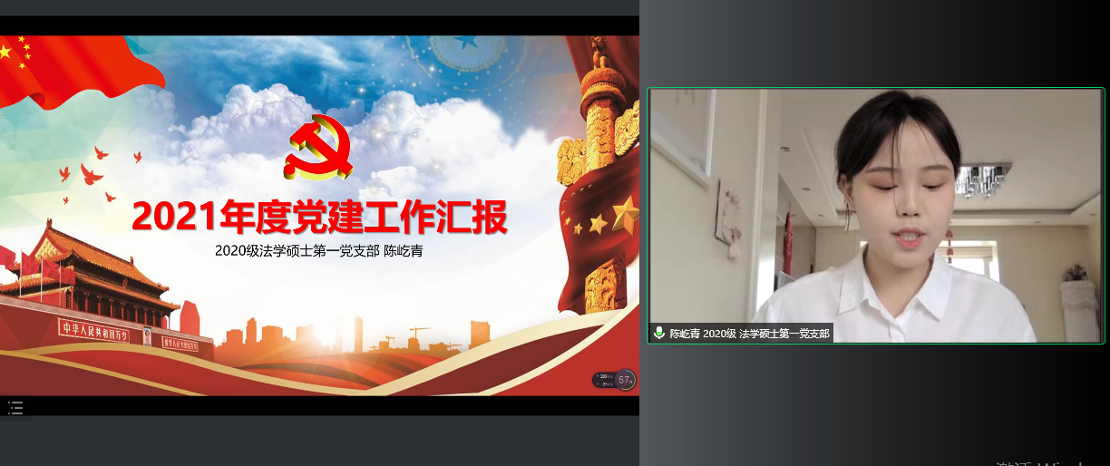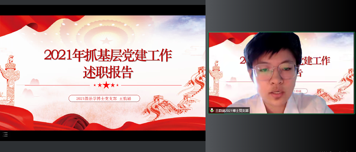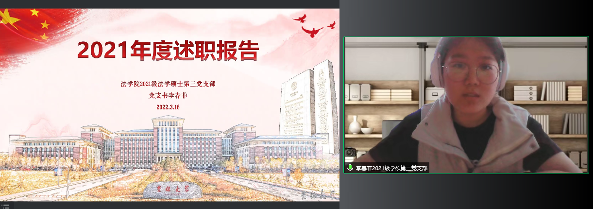 法公司党委书记周春国在总结点评中对各教工和员工党支部在2021年度党建工作中取得的成绩给予充分肯定,并对进一步做好基层党支部工作提出四点意见:首先,党支部工作的根本是实事求是,不能搞形式主义。要通过党支部“三会一课”的载体将之与教学科研、人才培养、员工成长等情况结合起来,与新时代e支部的建设结合起来,只有让每一位老师和同学在参加支部活动中有所收获才能增强党支部建设的生命力。第二,党支部工作的目标是提升党员的先进性。党支部的工作是为了不断巩固和扩大党执政的群众基础,因此工作中一定要抓住工作重点,比如当下全民抗疫,教师的工作重点应该是做好线上教学工作,关注关心员工生活;员工的工作重点应该是积极参与志愿服务,专注于提升学业成绩,严格遵守公司防疫规定。第三,党支部工作的水平取决于党支部书记的投入和付出。党支部书记是党最基层、最重要的先锋战士,如果党支部书记的政治站位不高,规划能力不足,付出程度不够,那么党员的工作状态无法保证,再好的规划与蓝图都难以落实,每一个党支部书记都应该是一面旗帜,要极其重视自己的岗位职责。第四,党支部工作的创新在于要抓住机遇。在当下抗疫的大背景中,党支部工作要能够与抗疫结合在一起,为抗疫献策,为抗疫助力,抓住抗疫,就抓住了凝聚所有党员的机会。周春国强调,公司每一位老师和每一位同学都是打赢吉大抗疫保卫战的中坚力量,感谢大家在抗疫工作中的付出,叮嘱大家在做好自我防护的同时肩负起党员干部的责任,共同努力为吉大法学今后的抗疫工作贡献力量。