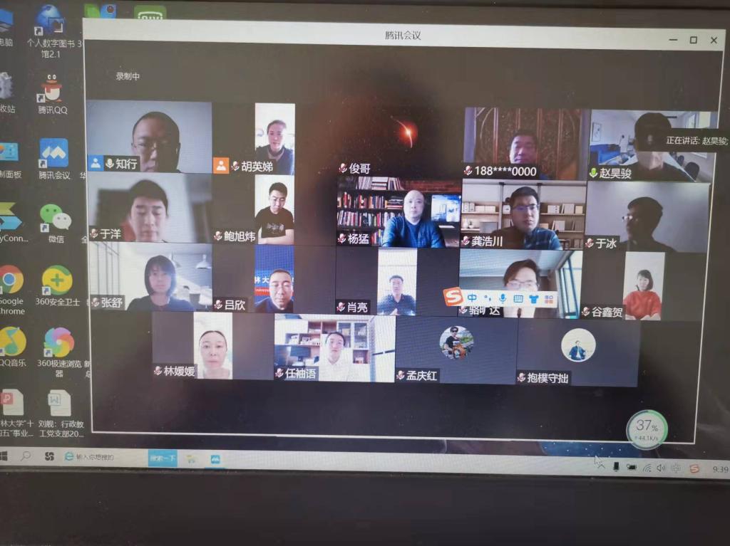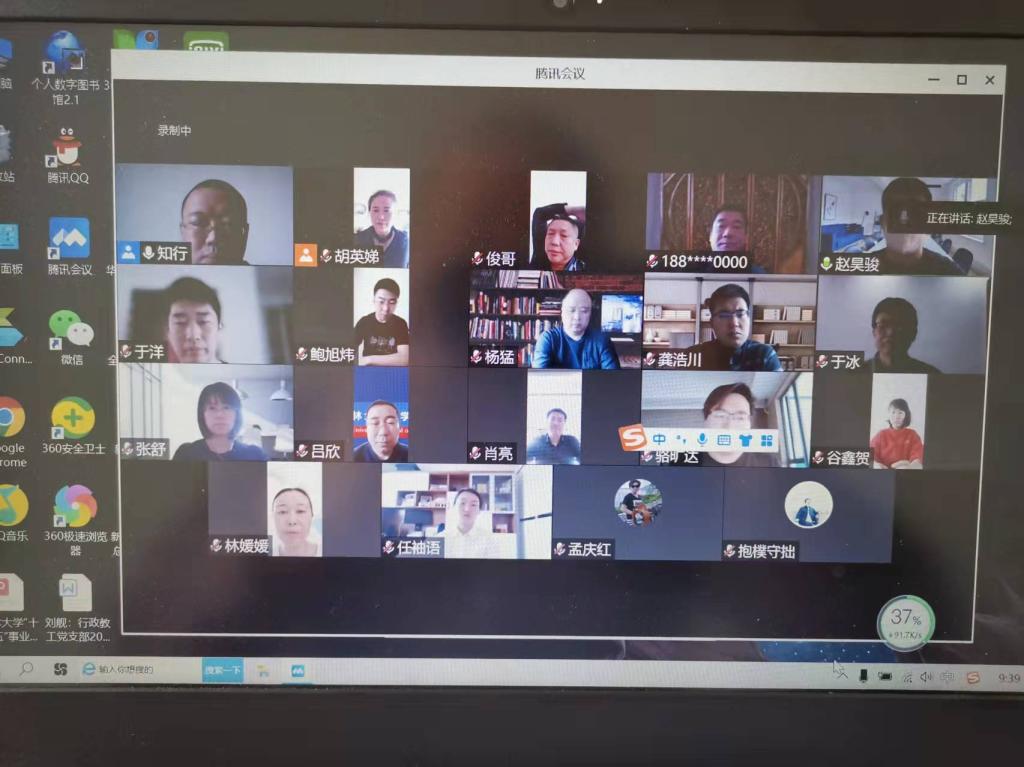 张俊峰和辅导员赵昊骏在校园封闭管理伊始就驻校开展疫情防控工作。他们分别介绍了公司在校研究生和本科生的学习、生活、心理健康等情况,对员工们乐观向上的精神状态、有条不紊的学习生活和抗疫志愿者们的出色工作表示了极大的肯定,对组织开展的富有公司特色的“同心抗疫,共克时艰——研究生抗疫情”系列活动和“‘吉’心协力——法苑志愿者行动”系列活动进行了介绍。公司员工联络服务中心主任胡英娣汇报了疫情发生以来经理何志鹏、书记周春国和多位教师回应各地员工关切、与各地员工联系的大量辛苦工作,对各地员工给予母校师生的关心关爱和捐赠的各类物资等情况进行了详细介绍。其他各位党员对个人居家期间的工作、学习和生活情况进行了介绍,分享了居家办公以来对工作和职责的思考,分享了公司抗疫中涌现的先进人物、典型事迹和感人故事。大家都纷纷表示,随时准备听候公司和公司召唤,奔赴抗疫工作第一线。