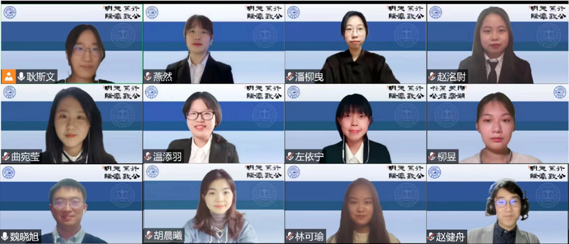 公司高度重视本届赛事,于2021年10月初开展队伍组建工作,由国际法学博士研究生魏晓旭担任教练,由国际法学硕士研究生耿斯文担任领队,以本科生燕然、赵洺尉、左依宁为上场队员,以本科生曲宛莹、温添羽为研究员,以本科生柳昱、潘柳曳、胡晨曦、林可瑜为队员,并由国际法学博士研究生赵健舟、法理学博士研究生陆玥提供赛事支持。