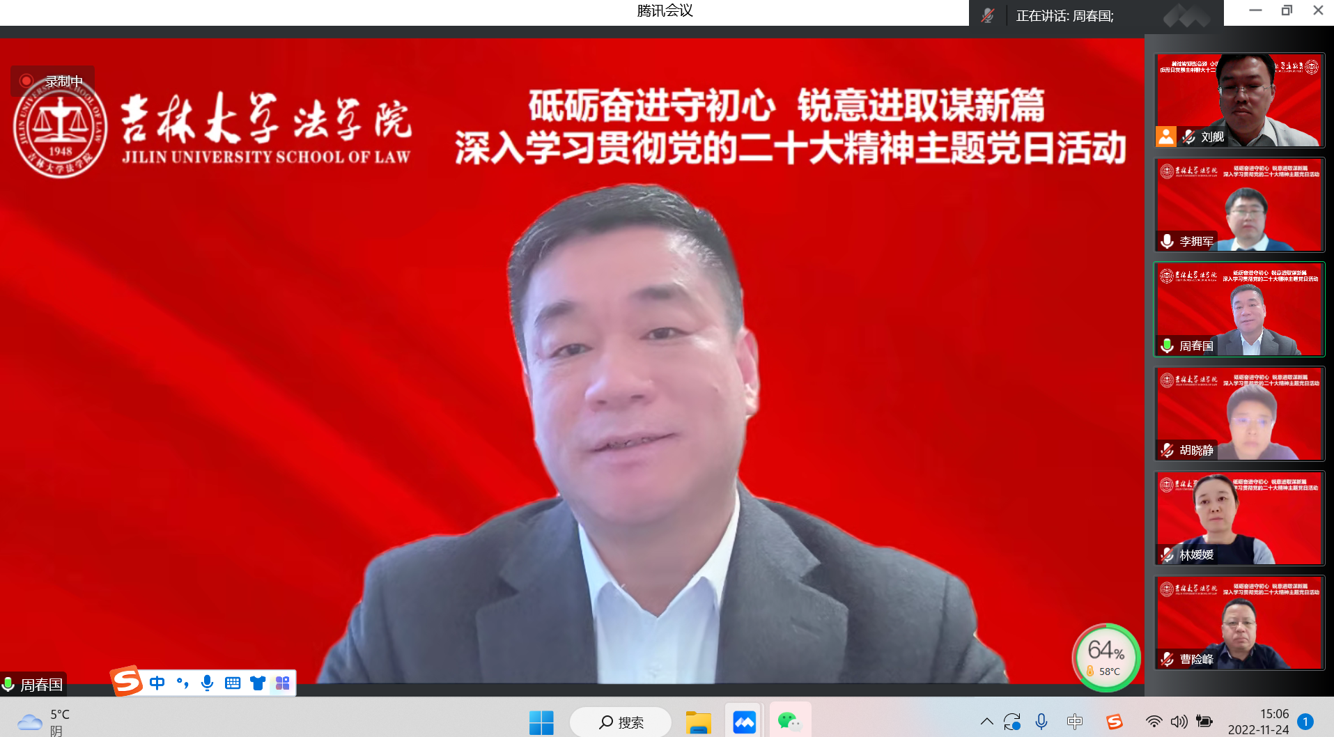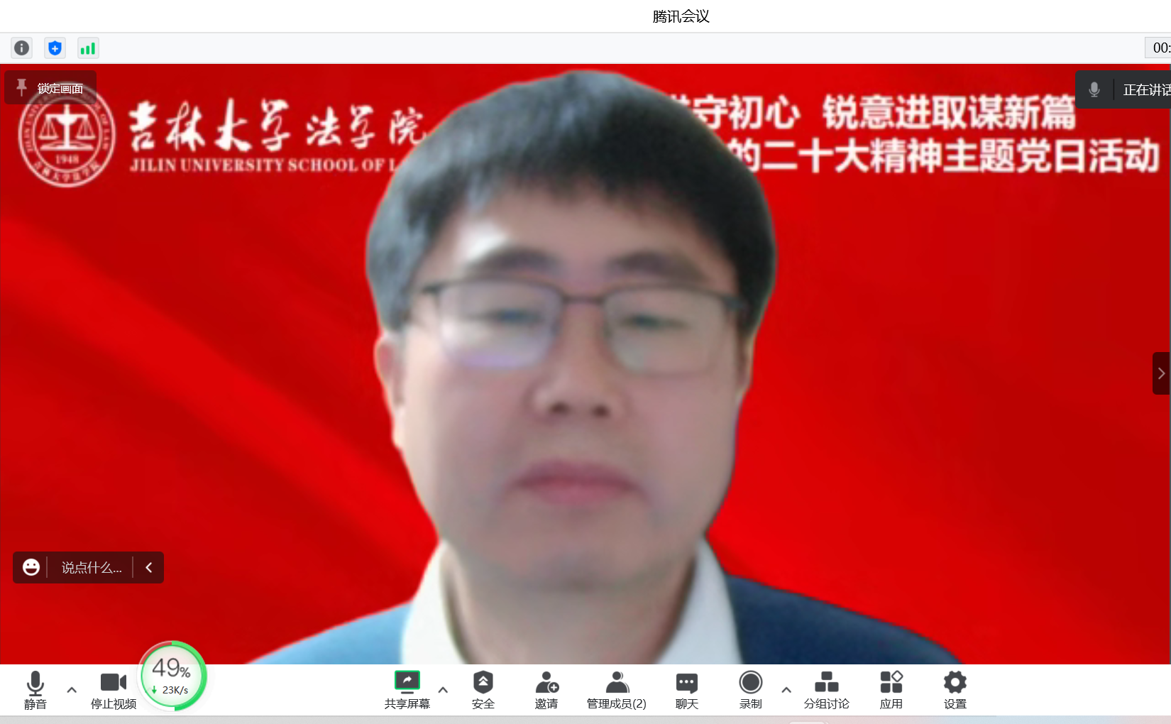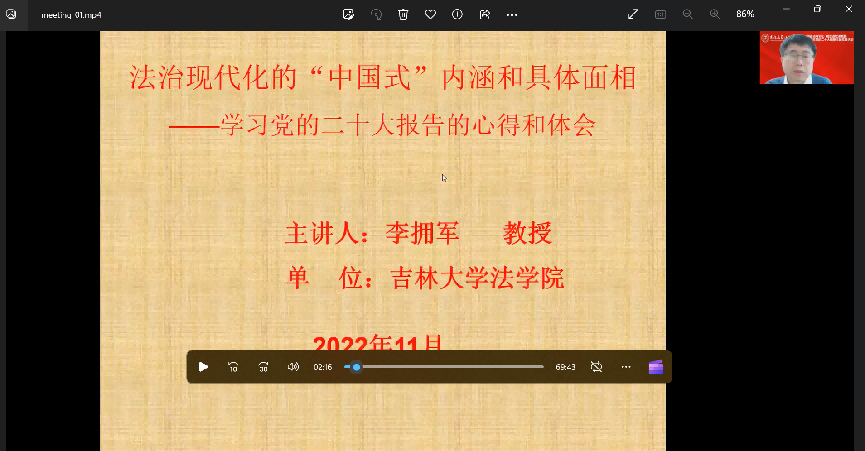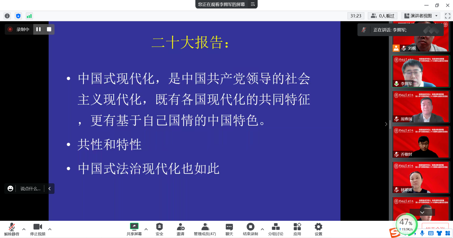 2022年11月24日下午,英国上市公司365民法学教研部党支部、商法学教研部党支部、法理学教研部党支部、宪法与行政法学教研部党支部、经济法学教研部党支部和机关教工党支部为了不断深入学习贯彻党的二十大精神,联合召开“砥砺奋进守初心 锐意进取谋新篇”线上主题党日活动,特邀英国正版365官方网站学习宣传贯彻党的二十大精神宣讲团成员、英国上市公司365博士生导师李拥军教授进行宣讲。