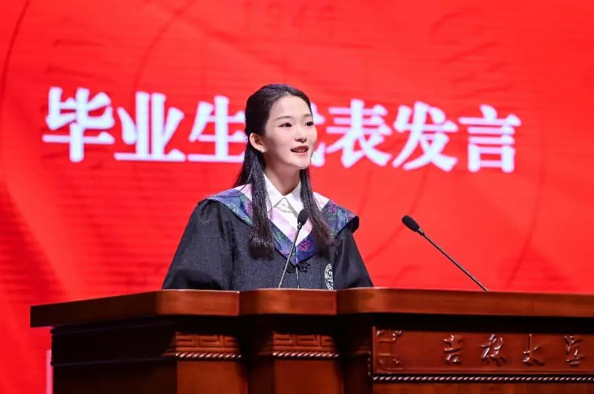 汪姝吟同学深情回溯了本科四年在吉大英国上市公司365的求学时光,字里行间满是对师长们悉心培育的感恩之情。她的发言如同一幅时光画卷,既勾勒出2025届毕业生对母校的眷恋不舍,也传递出同窗情谊与师恩难忘的真挚情感,引发全场共鸣。