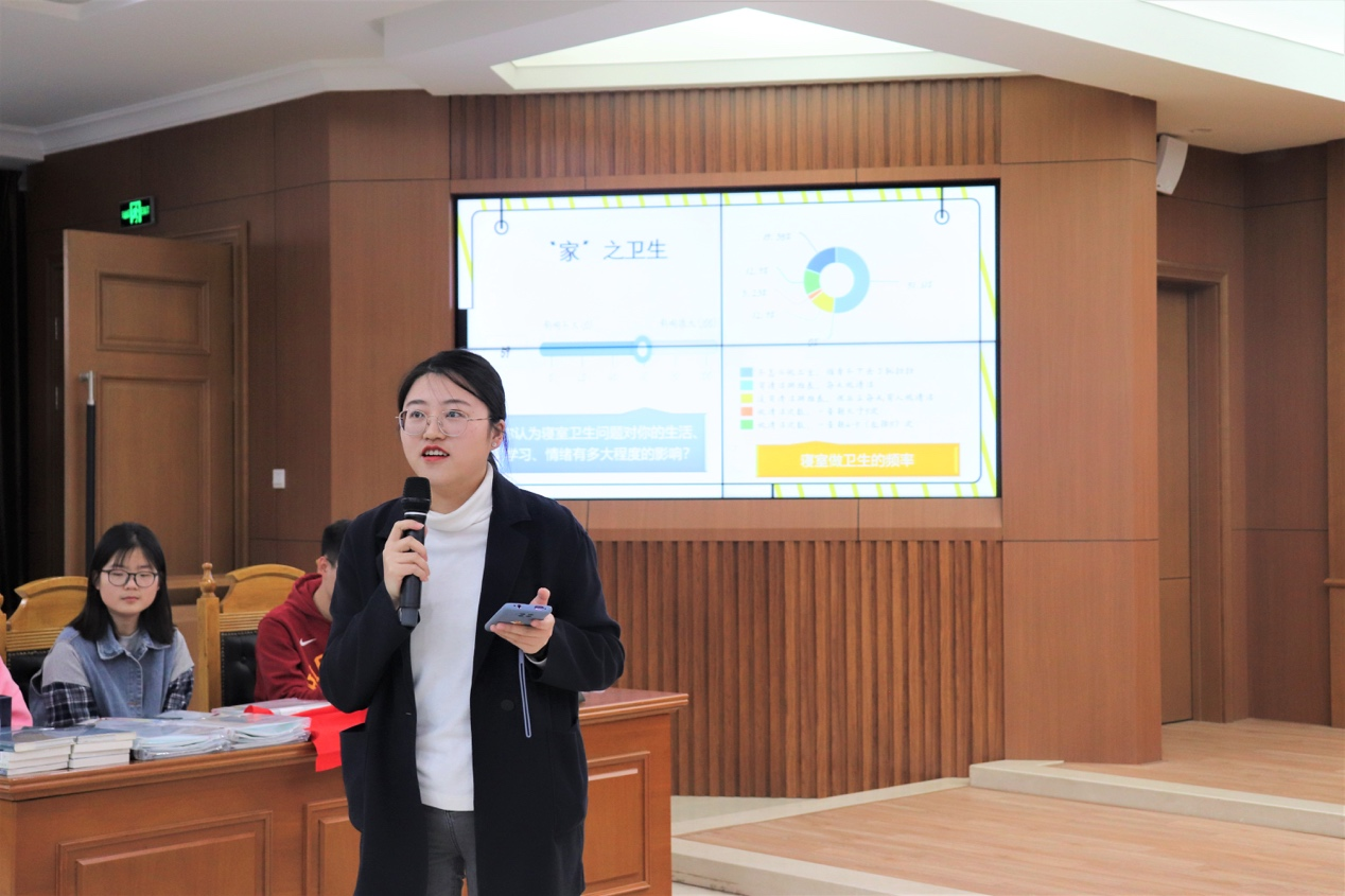 展示环节结束后,员工心理健康指导中心的余丽军老师根据活动前生管会同学收集的“寝室生活调查问卷”所统计出的数据,对统计结果进行了生动细致的讲解。余老师提出了寝室内部订立“寝室公约”的建议,以便更好地帮助同学们协调有着不同生活习惯的室友之间的关系。在谈及室友间发生矛盾该如何调解时,余老师给出了化“冷战”为“建设性争吵”的建议,她希望同学们能尽可能多地包容别人,理解别人。最后,余老师倡导同学们要尊重差异,尊重他人的人生规划,达到共同发展的目标。余老师的讲话既富有哲理又令我们感动,同学们也从中学到了很多处理室友关系、促进自身成长的好方法。