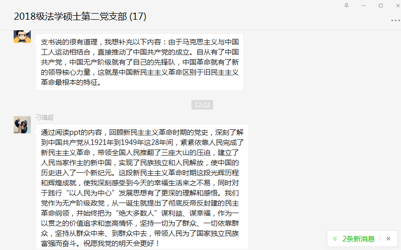 冯峻豪同志指出由于马克思主义与中国工人运动相结合,直接推动了中国共产党的成立,这也是中国新民主主义革命区别于旧民主主义革命最根本的特征。刁靖超同志通过本次党史学习,深刻感受到今天的幸福生活来之不易,同时对于践行“以人民为中心”发展思想有了更深的理解和感悟。我们党作为无产阶级政党,从一诞生就提出了彻底反帝反封建的民主革命纲领,并始终把为“绝大多数人”谋利益、谋幸福,作为一以贯之的价值追求和崇高情怀,坚持一切为了群众、一切依靠群众,坚持从群众中来、到群众中去,带领人民为了国家独立民族富强而奋斗。杨秀昌发言表示通过这次学习,深刻地认识到新民主主义革命的伟大历史意义。中国新民主主义革命的胜利,结束了帝国主义、封建主义和官僚资本主义在中国的统治,建立了人民民主专政的新中国。同时中国新民主主义革命的胜利,对世界历史的发展也发生了巨大的影响。中国革命的胜利,是十月革命胜利后,国际共产主义运动史上最重大的事件。中国革命的胜利,是马克思列宁主义、毛泽东思想的胜利。