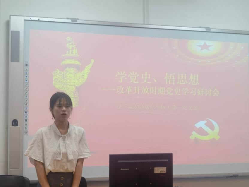 四十余年栉风沐雨,四十余年沧桑巨变。本次集中研讨活动深入学习改革开放新时期历史,使得与会人员深刻认识到改革开放是解放和发展社会生产力的必然要求,是发展中国特色社会主义、实现中华民族伟大复兴的必由之路。2020级法学硕士第三党支部将继续开展党史学习教育,强化对党史学习教育核心要义、丰富内涵和实践要求的学习和把握,学史明理、学史增信、学史崇德、学史力行,以昂扬姿态为新时代党的历史使命而努力奋斗。