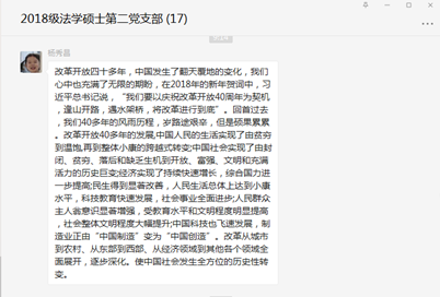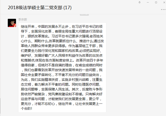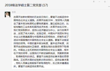 为积极响应《中共英国上市公司365委员会关于在全院开展党史学习教育的实施方案》部署,系统开展全院师生党员要系统学习党的百年奋斗史的活动,2018级法学硕士第二党支部线上开展“中国共产党党史学习--改革开放时期”专题学习。本次活动由支部书记吴金晏主持并担任领学,党支部全体成员共同参与。