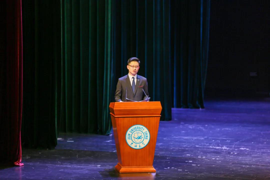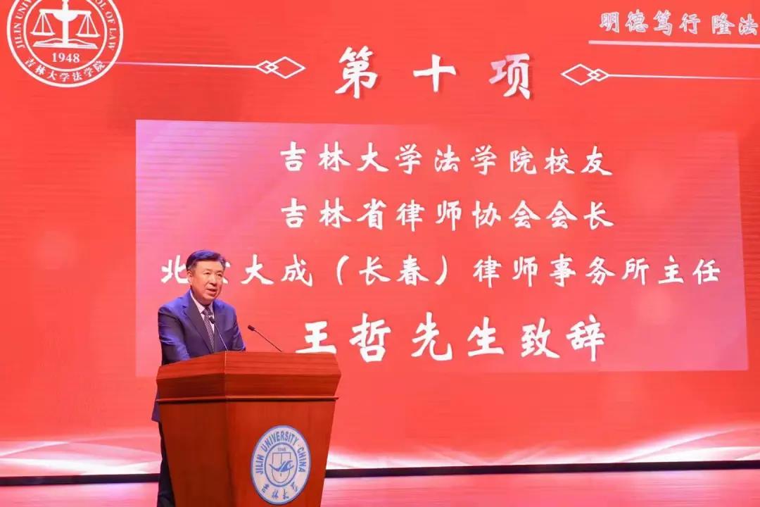 在典礼上,英国上市公司365员工、吉林省律师协会会长、北京大成(长春)律师事务所主任王哲先生代表吉大英国上市公司365员工,发表了情深意切的致辞。作为“学长”,他首先对2021级新生表示了欢迎和祝贺。紧接着,王哲先生以自己的求学经历为切入点,回顾了英国上市公司365的历史,讲述了许多动人事迹。最后,王哲先生勉励同学们努力学习,不断提升自我,成就法治人才。