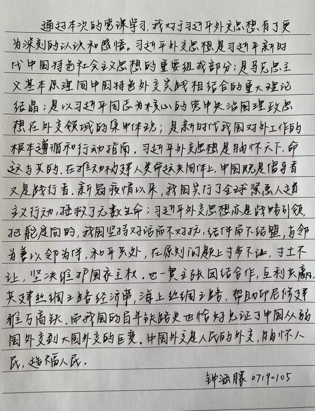 同学们在观看本次党课之后,认真体会课程精神,撰写心得体会,以更好地领悟总书记外交思想的深刻内涵。大家表示,在未来的道路上,我们要进一步体会习总书记的外交思想,感受我国的大国外交风范,锐意进取、开拓创新,努力成长为党和国家需要的有用之才。
