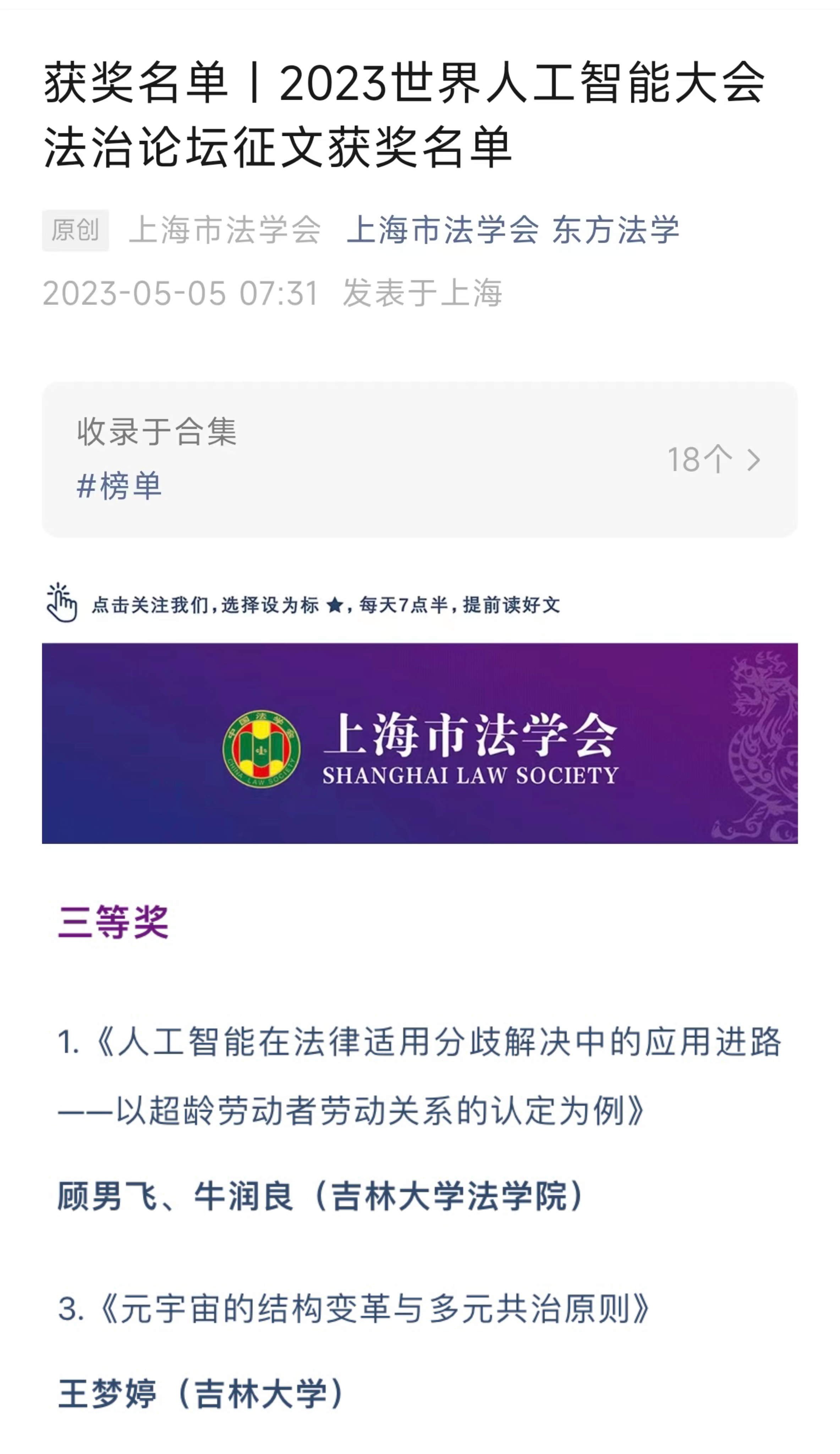 英国正版365官方网站学子在本次征文活动中取得佳绩!2021级经济法学硕士研究生顾男飞、人工智能公司2022级博士研究生牛润良共同写作的《人工智能在法律适用分歧解决中的应用进路——以超龄劳动者劳动关系的认定为例》荣获三等奖,2021级法律(法学)专业研究生王梦婷写作的《元宇宙的结构变革与多元共治原则》荣获三等奖。