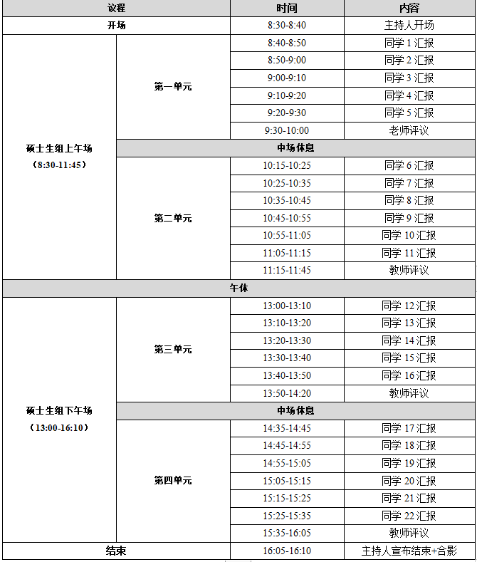 硕士研究生每人汇报时间为≤10分钟。