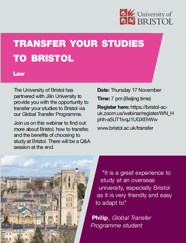 请有意向参加会议的同学,于会议开始前,将附件1《布里斯托大学宣讲会报名表》,发送至lawglobal@jlu.edu.cn。