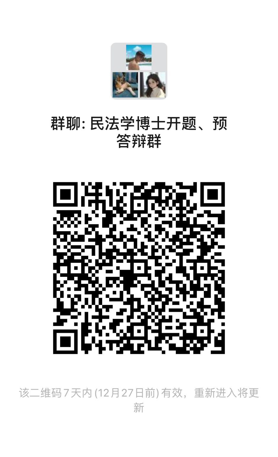 请参与本次预答辩的硕士研究生及时扫码入群(硕士生入群后请在“我在本群的昵称”中写明“学硕/法本法硕/非法本法硕+姓名”,如:学硕张三)。