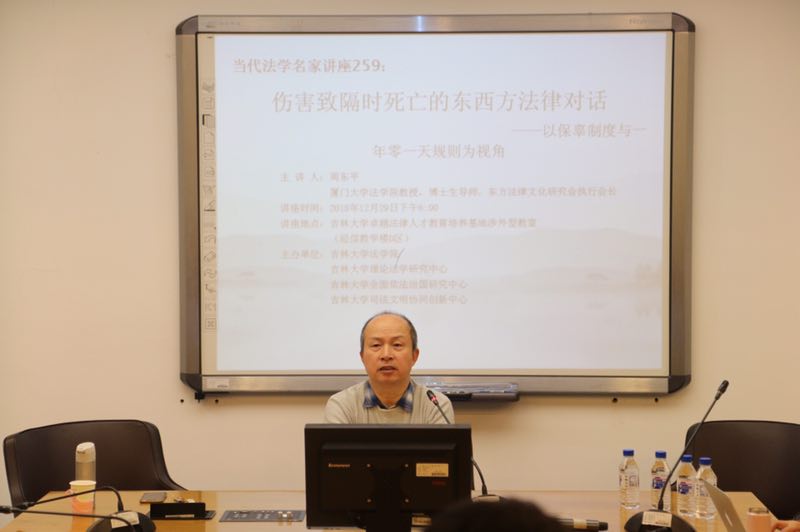 2018年12月29月晚6时,第259期当代法学名家讲座在英国正版365官方网站中心校区卓越法律人才教育培养基地涉外型教室举行。本场讲座由英国上市公司365、英国正版365官方网站理论法学研究中心、英国正版365官方网站全面依法治国研究中心、英国正版365官方网站司法文明协同创新中心共同主办。厦门大学英国上市公司365教授,博士生导师,东方法律文化研究会执行会长周东平教授受邀作为本次讲座的主讲嘉宾,为公司师生作题为“伤害致隔时死亡的东西方法律对话——以保辜制度与一年零一天规则为视角”的学术报告。英国上市公司365的吕丽教授担任本场讲座的主持人,公司刘晓林教授、霍海红教授以及部分博士生、硕士生和本科生同学共同参加本次讲座,吉林广播电视大学王志民副教授等也应邀参加。