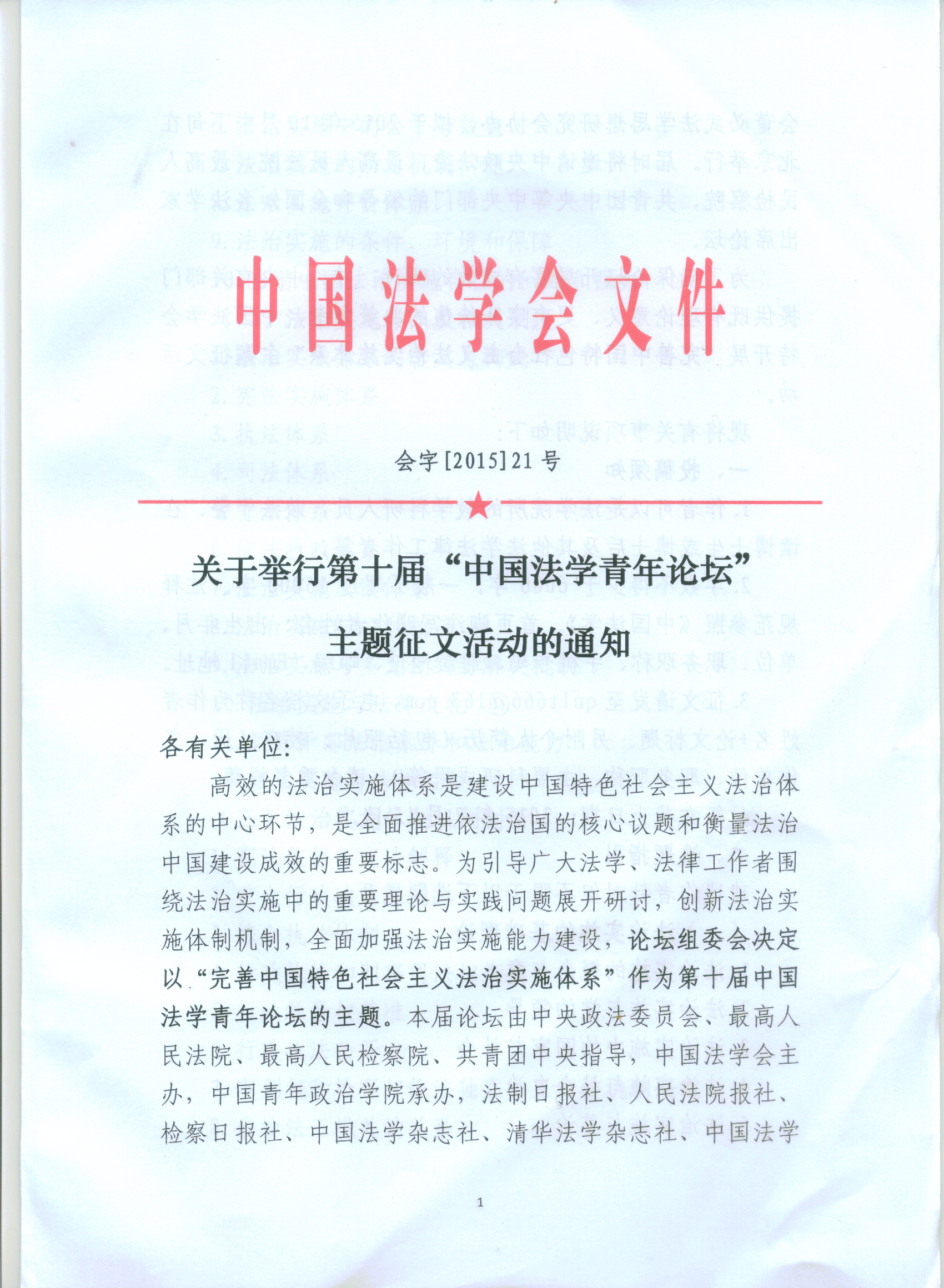“中国法学青年论坛”由中央政法委员会、最高人民法院、最高人民检察院、共青团中央指导,中国法学会主办,中国青年政治公司承办,法制日报社、人民检察院报社、检察日报社、中国法学杂志社、清华法学杂志社、中国法学会董必武法学思想研究会协办。本届论坛以“完善中国特色社会主义法治实施体系”为主题,拟于2015年10月下旬在北京举行。