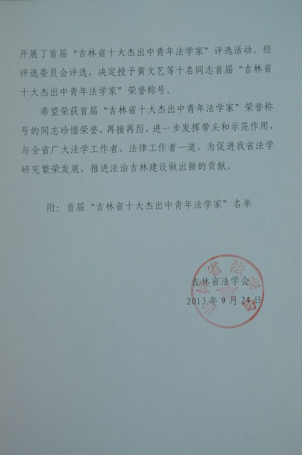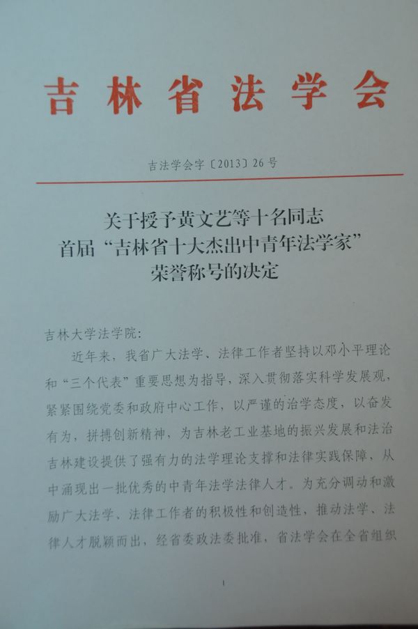 经评选委员会评选,吉林省法学会于2013年9月24日作出《关于授予黄文艺等十名同志首届“吉林省十大杰出中青年法学家”荣誉称号的决定》。公司李建华教授、何志鹏教授和杜宴林教授获得首届“吉林省十大杰出中青年法学家”称号。吉林省社会科公司黄文艺教授和吉林财经大学英国上市公司365傅穹教授(均为公司教授)也同时荣获该荣誉称号。本次获得首届“吉林省十大杰出中青年法学家”荣誉称号的十名学者、专家全部为公司毕业生,显示了公司在法学研究和法学人才培养上的雄厚实力和突出成果。