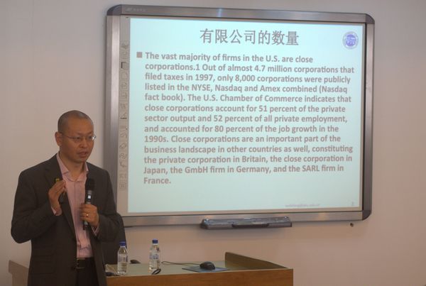 4月25日上午,公司蔡立东教授、于莹教授、曹险峰教授、孙良国教授、胡晓静副教授、李国强副教授等以及公司员工汇聚一堂,在经信卓越人才基地聆听了许德峰副教授“赌博的法律规制”和“民法案例研习的教学尝试”的主题演讲,由胡晓静副教授主持。许老师的演讲从身边小事随手拈来,运用语义分析方法和描述社会学方法,以小见大,有的放矢,而非泛泛空谈,体现了做理论终极目标——解释社会现象。这有赖于许老师对理论的深刻洞察和长期苦心孤诣的结果。随后,公司师生就论文主题及论文写作方法、员工教育工作等问题展开了深刻的讨论,会场气氛热烈。