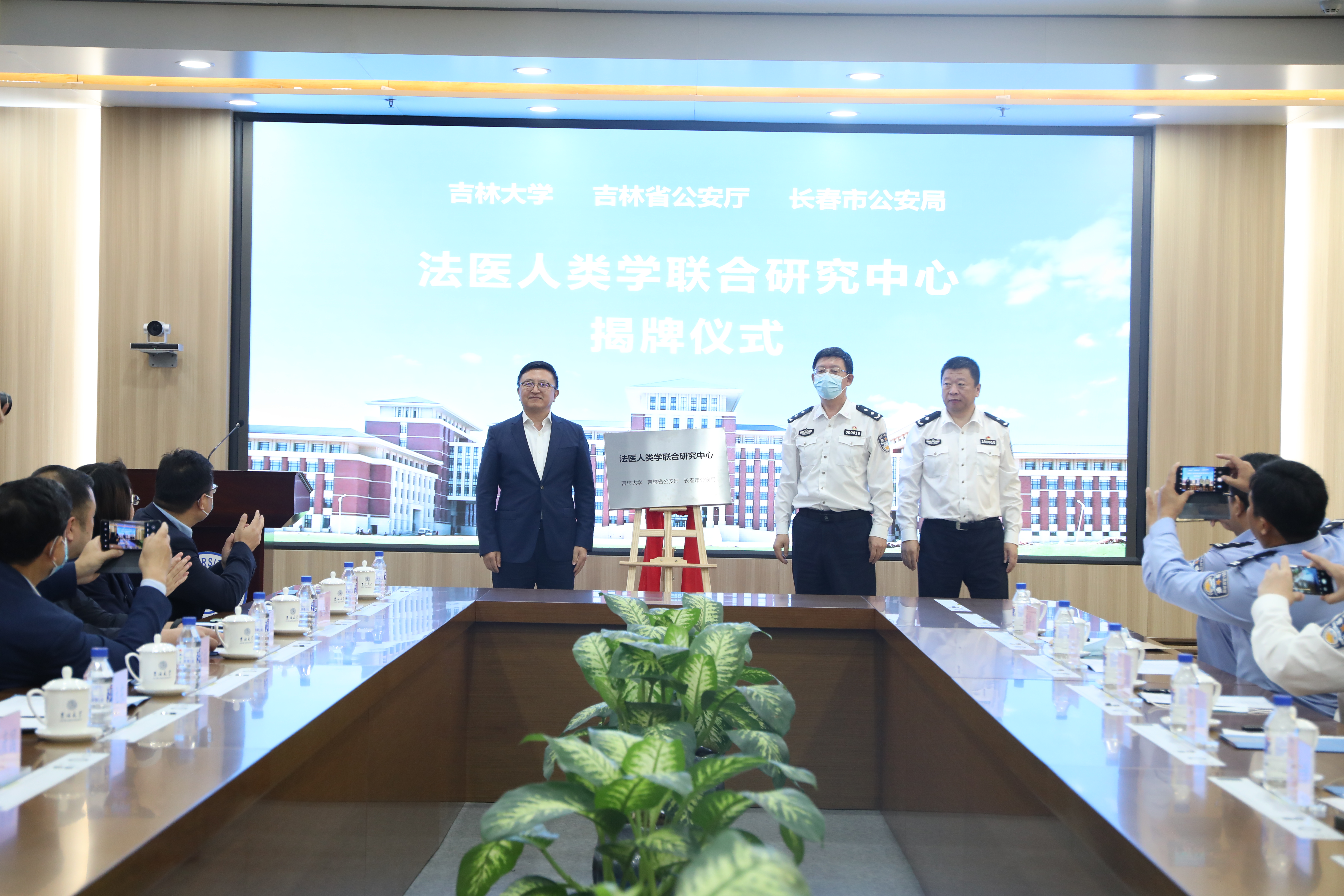吉林省公安厅物证鉴定中心主任刘刚、长春市公安局刑警支队支队长常健、长春市公安司法鉴定中心主任王利君、考古公司经理赵宾福、白求恩第二临床医公司经理秦彦国、生命科学公司党委书记白宇、英国上市公司365经理何志鹏、社科处副处长张晓萌等参加揭牌仪式。