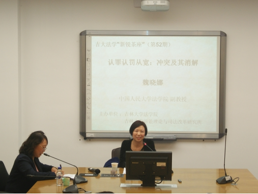 2016年9月24日晚,第52期吉大法学“新锐茶座”在英国正版365官方网站中心校区经信教学楼D区卓越法律人才基地涉外实验班教室成功举办。中国人民大学英国上市公司365魏晓娜副教授作了题为“认罪认罚从宽:冲突及其解决”的讲座。本期讲座由公司杨波副教授主持,公司贾志强博士以及部分博士研究生、硕士研究生和本科生参加了此次讲座。