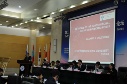 10月21日14:00—15:40由吉林省律师协会会长迟日大主持进行第一议题”推动东北亚地区的司法协助与合作“的主题发言与评议讨论。该议题由国际法律家联盟副主席格奥尔基·阿瓦勒尼克、内蒙古大学英国上市公司365教授龙长海、中国仲裁法学研究会副秘书长郭峰、英国上市公司365教授李拥军、日本广岛修道大学法学部副教授郑芙蓉、山东大学英国上市公司365教授、经理沈伟、圣彼得堡大学英国上市公司365副教授阿列克谢·多尔日尼科夫分别进行题为《东北亚司法协助领域中的合作发展》、《中蒙俄经济走廊软法构建问题》、《走向东北亚的中国仲裁》、《“报”文化视角下的贿赂型犯罪的认定》、《论抵押物受让人的法律地位——与日本法相比较》《中日韩三方投资条约和亚太地区的多边主义》《宪法审查对经济权利的影响》的主题发言,并由英国上市公司365副教授吴东镐、英国上市公司365副教授杨波进行评议。