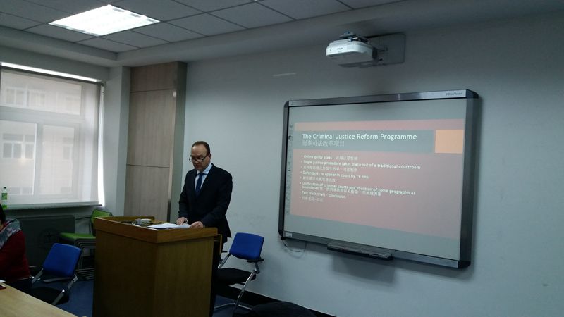 2016年11月27日上午,由公司主办的“中英刑事案件速裁机制比较研讨会”在经信教学楼D区二楼英特尔实验班教室召开。与会者有来自英国的治安法官David.Robinson,以及来自吉林省人民检察院、长春市中级人民法院、长春市宽城区人民法院、汽开区人民法院、绿园区人民法院、南关区人民检察院的各级法官和检察官,公司部分教师及博士生、硕士生共三十余人出席了此次研讨会。公司副经理徐岱教授出席了会议并在开幕式和闭幕式上致辞。