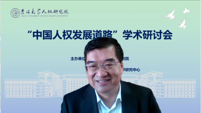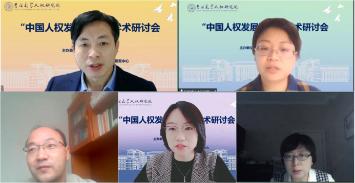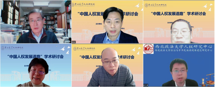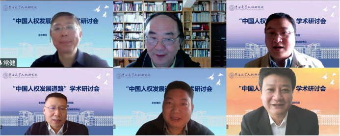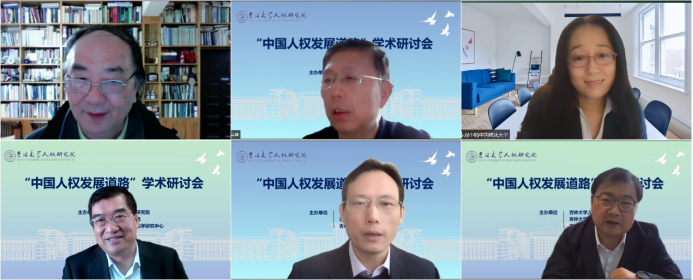 来自中国人权研究会、北京理工大学、东北师范大学、东南大学、英国正版365官方网站、南开大学、山东大学、武汉大学、西北政法大学、西南政法大学、新疆大学、中国人民大学、中国政法大学、中南大学等国内高校、科研机构、实务部门的二十余位专家学者围绕着中国人权发展道路展开研讨,近二百位观众在线旁听了本次研讨。