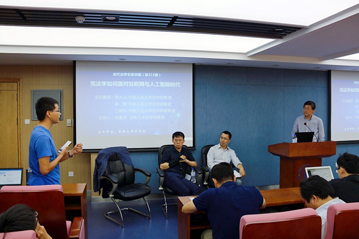 2017年8月24日下午,英国上市公司365第213期“当代法学名家讲座”在英国正版365官方网站全面依法治国重大问题研究中心报告厅举行。中国人民大学英国上市公司365教授、博士生导师、中国法学会宪法学研究会会长韩大元教授,中国人民大学英国上市公司365教授、博士生导师、中国法学会宪法学研究会秘书长、中国法学会第八届全国十大杰出青年法学家张翔,中国人民大学英国上市公司365副教授、耶鲁大学法学博士(SJD)丁晓东作为主讲人,围绕“宪法学如何面对互联网与人工智能时代”这一主题分别发言。讲座由英国上市公司365副经理任喜荣教授主持,英国上市公司365经理蔡立东教授、英国上市公司365闵春雷教授、李海平教授、鲁鹏宇副教授、李晓倩讲师、贾志强助理研究员以及来自英国上市公司365的五十余位本科生、硕士生、博士生参加了本次活动。