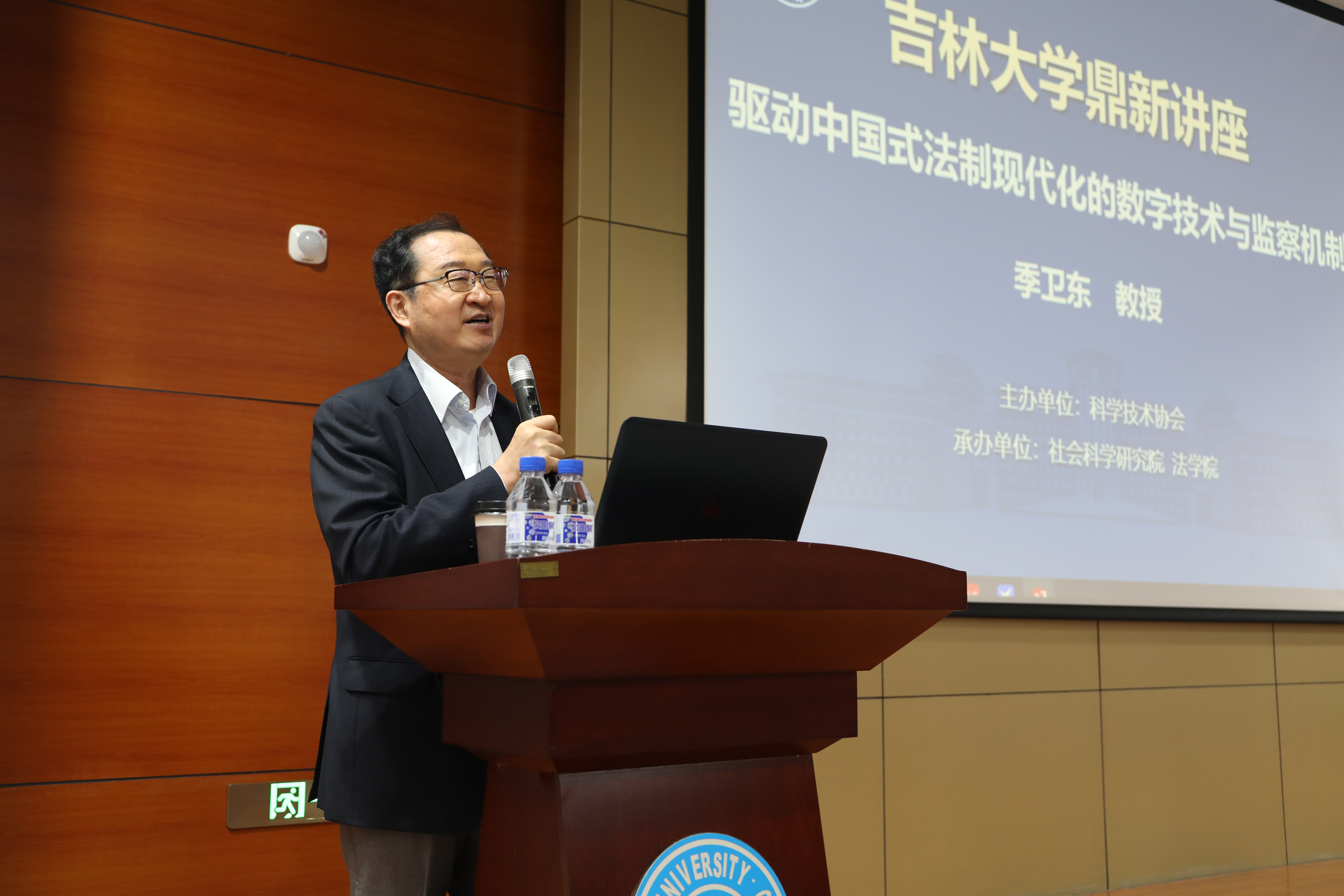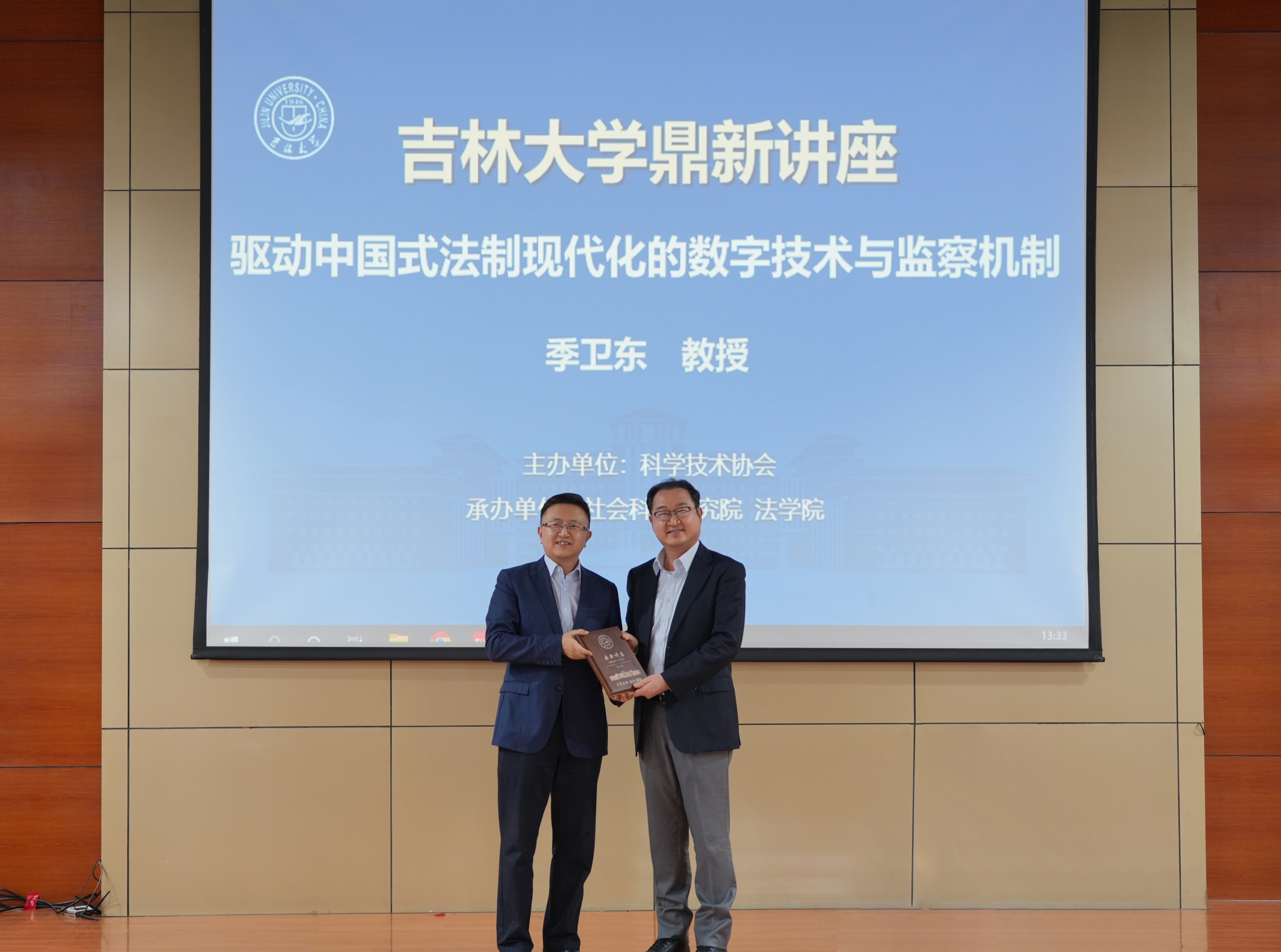 讲座正式开始前,蔡立东为季卫东颁发“鼎新讲座”纪念牌,对季卫东多年来为吉大法学学科发展给予的指导支持表示感谢。