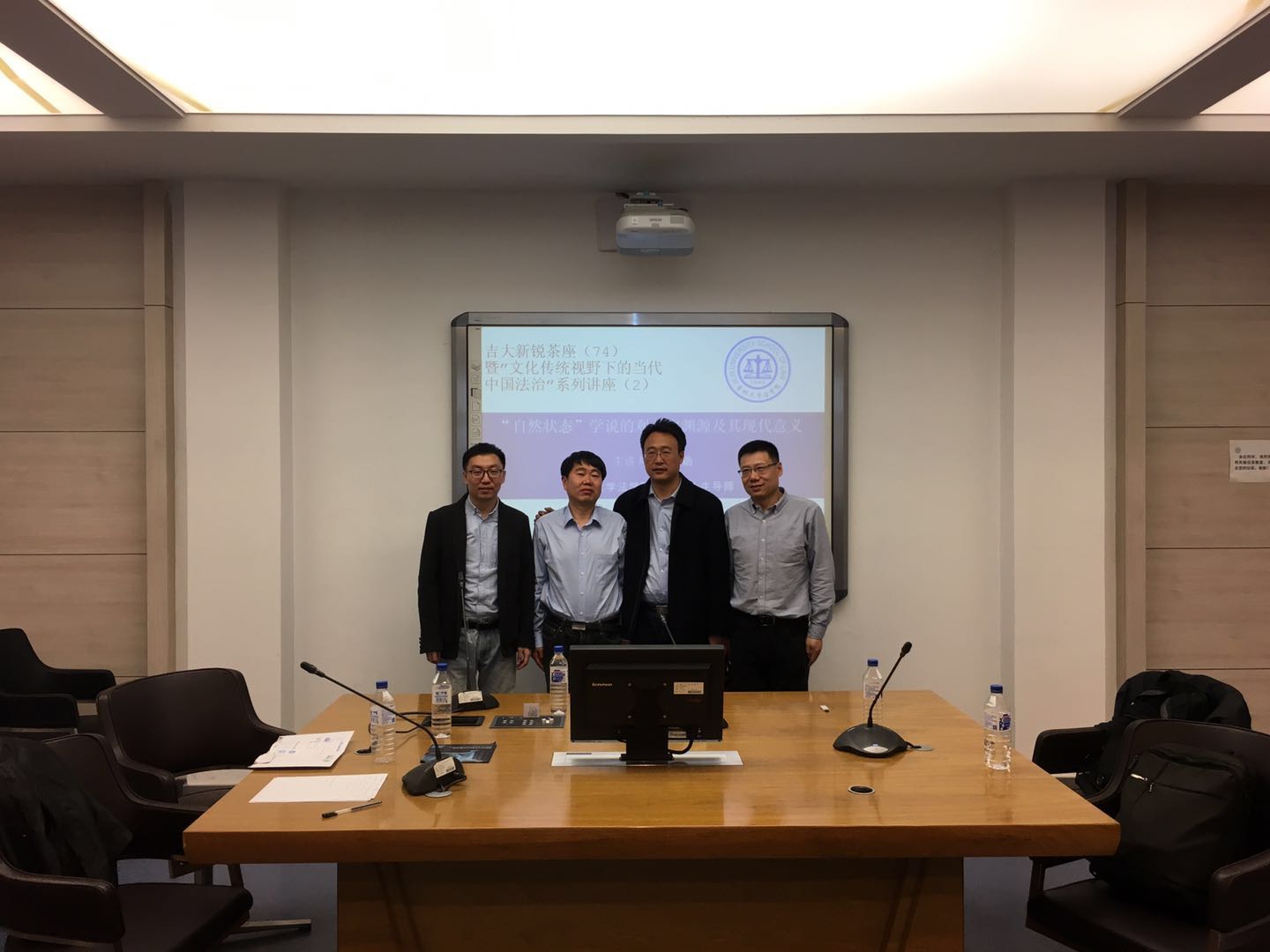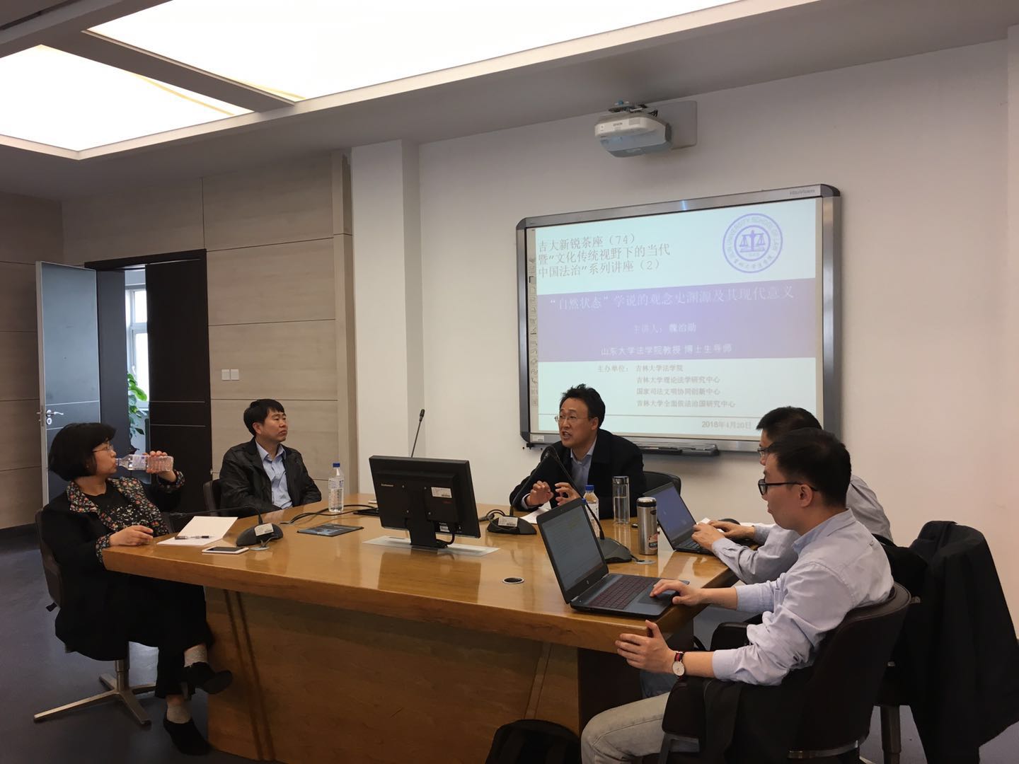 2018年4月20日下午14:00,英国上市公司365主办的第74期吉大法学新锐茶座在英国正版365官方网站中心校区经信教学楼卓越法律人才基地涉外班教室成功举行。山东大学英国上市公司365教授、博士生导师魏治勋应邀做了题为 “‘自然状态’”学说的观念史渊源及其现代意义 ”的学术讲座。此次讲座也是公司李拥军教授主持的“文化传统视野下的当代中国法治”学术活跃计划的一部分。