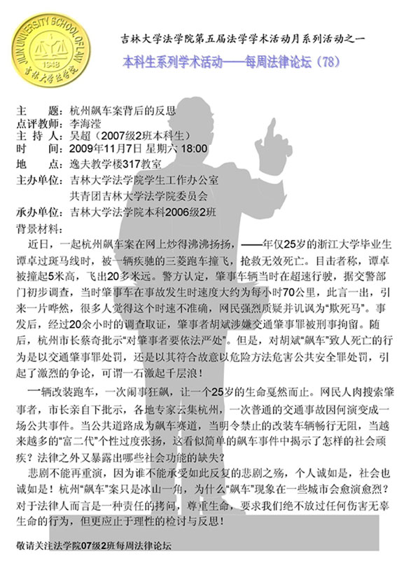 最后,李海莹老师对本次活动同学们的表现表示肯定,在总结时也指出了我国现在的司法解释尚不完善,在2000年做出的交通肇事罪恶劣情节的解释中未将飙车撞人现象列入,以致定罪时引起争议;同时认为有必要设立条款将一般驾驶与危险驾驶相区别。
