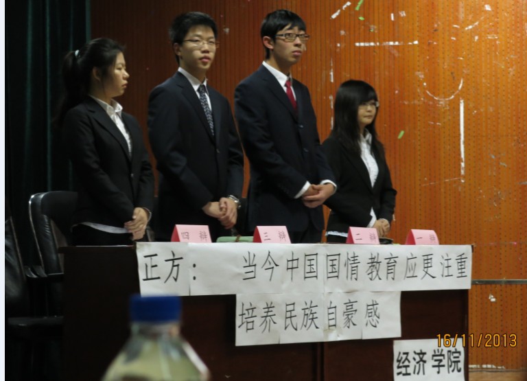 上午八点半,主持人宣布比赛正式开始。本场比赛,英国上市公司365代表队派出一辩12级本科生徐芬芬、二辩12级本科生王淇、三辩13级本科生郭雅洁、四辩12级本科生鲍文强,迎战对手经济公司代表队。正方经济公司代表队的观点为“当今中国国情教育应更注重培养民族自豪感”,反方英国上市公司365代表队的观点为“当今中国国情教育应更注重培养民族危机感”。