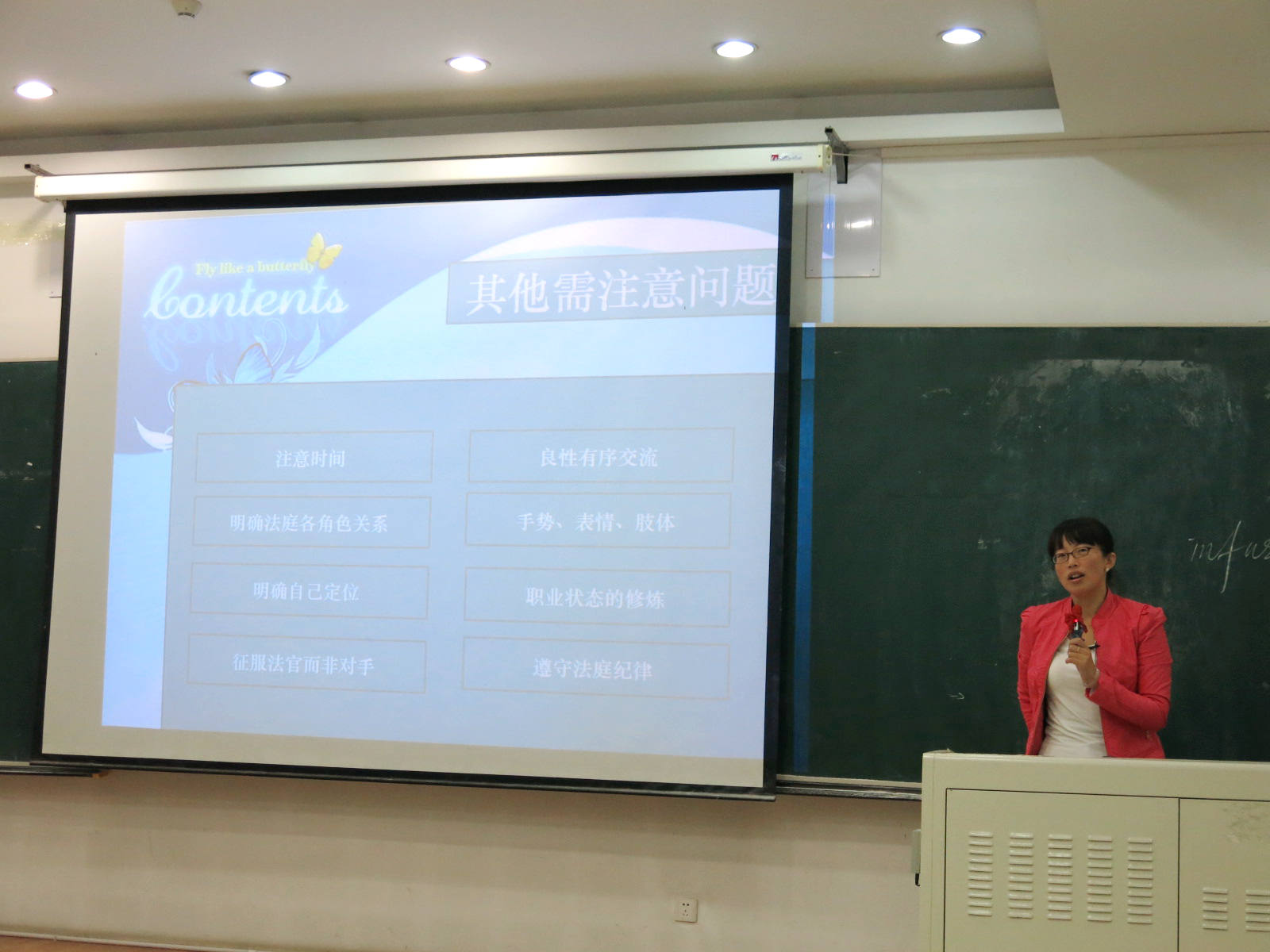 在第四部分中,田老师向同学们介绍了模拟法庭比赛复赛阶段的一些新特点和注意事项。在复赛阶段评委对参赛队员的要求会有所提高,所提问题的难度也会随之加大。随着此阶段比赛的专业性和学术性的提高,队员也要在赛前做更加充分的准备,以在比赛时满足评委对队员素质更高的要求。
