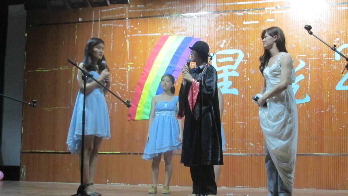 紧接着,是反串版的童话故事《白雪公主》。剧中引用了大量现代的表现手法,以诙谐幽默的台词和反差巨大的人物形象吸引了现场观众的极大兴趣。尤其当卢雨捷同学饰演的“女主角”白雪公主上场时,场下一阵惊呼,将全场气氛带向了高潮。演员们夸张的表演和搞笑的剧情设定,让全场观众忍俊不禁。这个故事告诉了我们一个最简单也是最容易被忽略的道理:外在美与内在美比起来,只有心灵的美丽才是真的美丽。