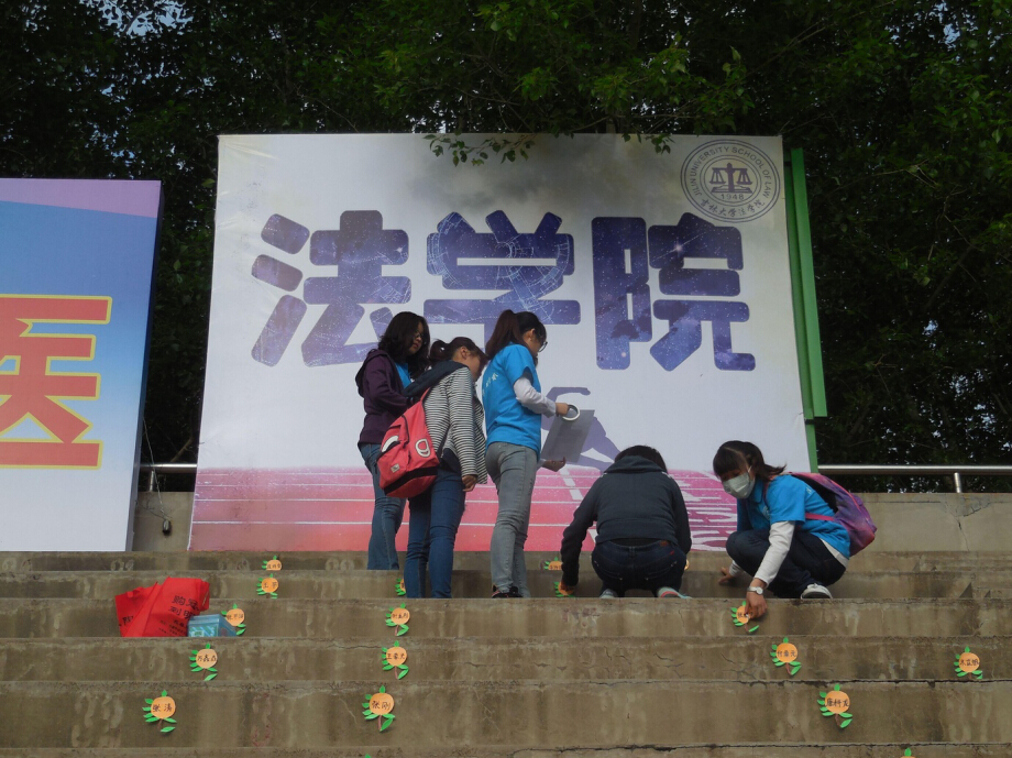 早晨6点左右,生管会工作人员已经投入到一天的忙碌工作中。女生们在看台上贴座签、摆放坐垫和手摇花等道具,男生去搬运大鼓、扩音器、饮用水等大型备品。同时为了防止观众出现中暑等突发症状,生管会贴心的准备了“金嗓子喉片”、“藿香正气水”等药品。其中,本次观众团的每一个座签都是由工作人员纯手工制作,创意性地剪成了“法”字形状的“向日葵”,并涂染成阳光般的金黄色,既展现了英国上市公司365特色,又响应了“阳光体育”的主旨号召,在整个运动会观众席中别具一格。