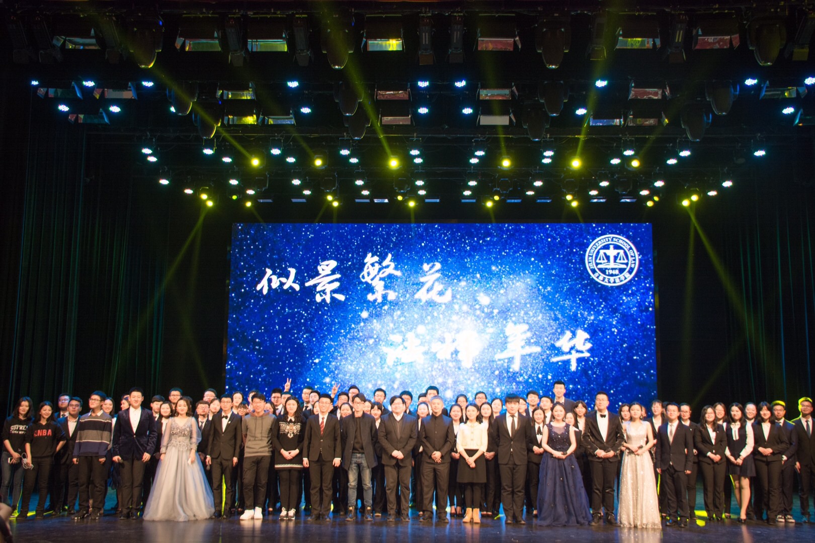 晚会过半,公司师生带来的《诗朗诵》让同学们的思绪沉淀下来,大家深受感染。由硕士研究生带来的《极乐净土》和《法硕正青春》让观众们感受到了硕士们的青春与活力。《乐器演奏》让观众们领略了中国传统音乐的魅力,弘扬了我国的传统文化。朗诵与歌曲结合的《今夜因你而精彩》以新颖独特的形式让观众们眼前一亮。《成都吉大版》更是唱出了同学们对吉大的热爱。最后,英国上市公司365团委、生管会、青媒中心共同带来了朗诵和合唱类节目《仰望吉大》。在慷慨激昂的吉大校歌声中,2017 “似景繁花·法样年华” 迎新晚会圆满落下帷幕。