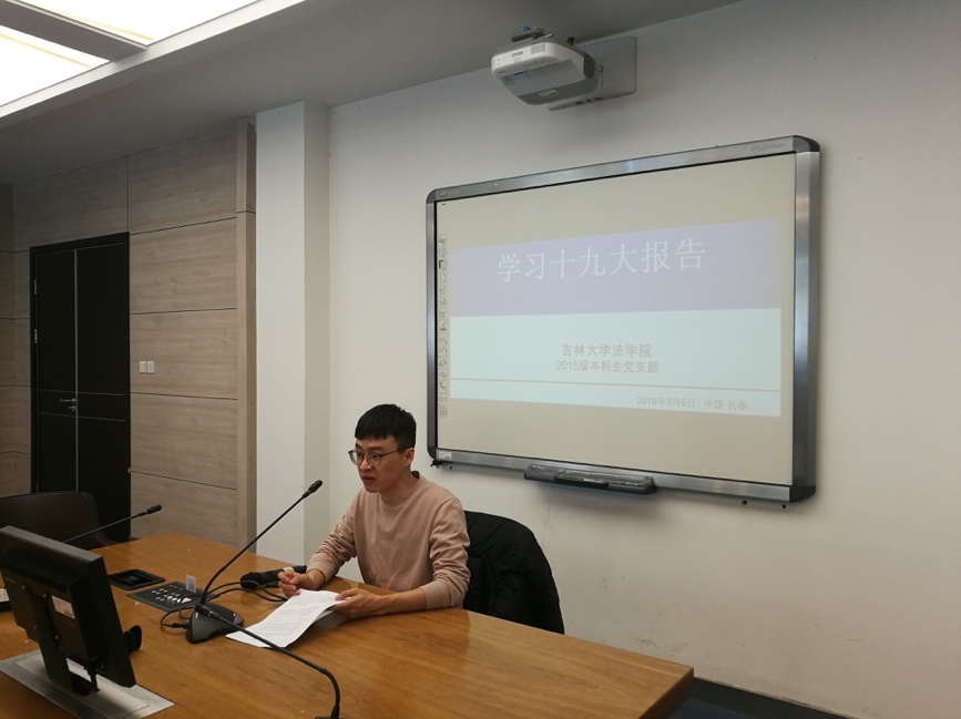 9日下午1点半, 2015级党支部组织生活会在经信教室召开。首先,2015级兼职辅导员张旭就十九大报告重点学习内容进行了发言。他通过讲述“八个明确”、“十四个坚持”,强调员工党员应当明确我党发展建设目标、了解我国新时代中国特色社会主义的基本方略。他希望党支部的各位同志牢固树立“四个意识”,即政治意识、大局意识、核心意识、看齐意识,自觉在思想上、政治上、行动上同党中央保持高度一致,对支部与个人存在的问题进行反思,并主动进行调整、纠正、校准。