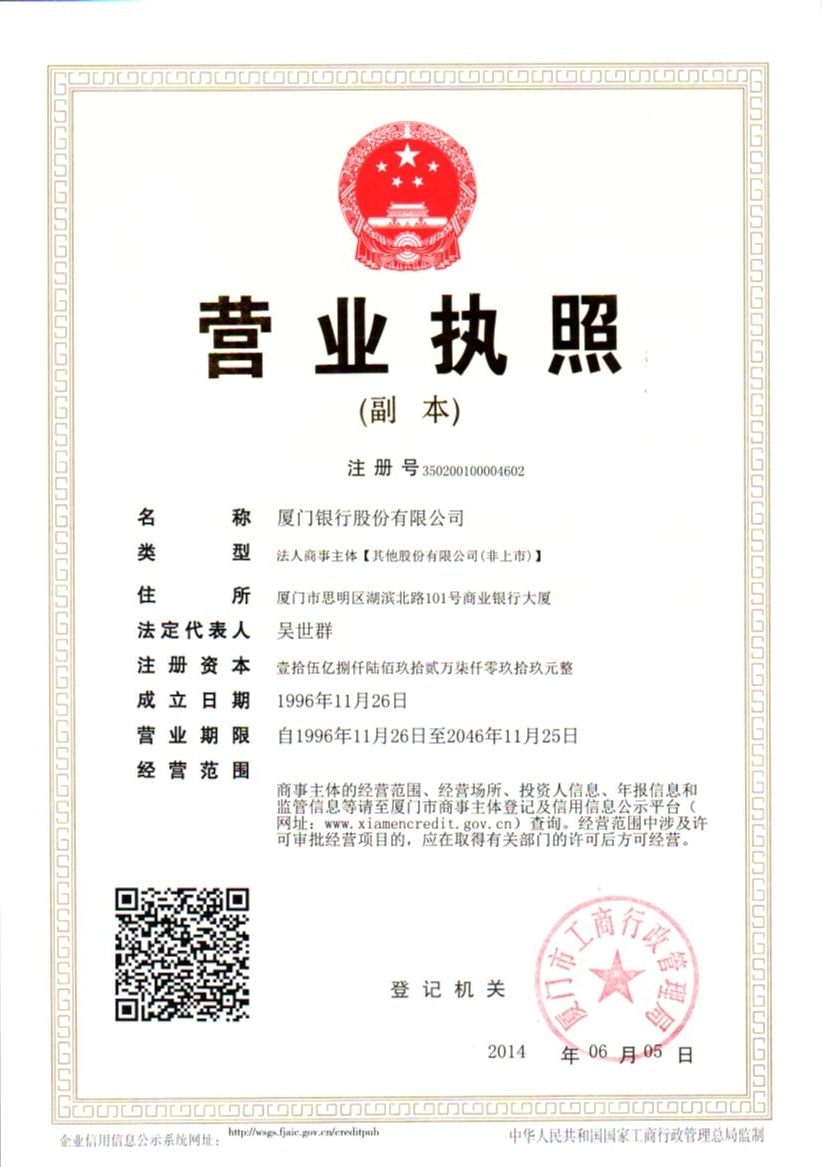厦门银行成立于1996年11月30日,是经中国人民银行批准、具有独立法人资格的股份制商业银行,现有注册资本15.87亿元,其中厦门市财政局为第一大股东。2008年,厦门银行首开两岸三地金融业合作之先河,成功引进具有台资背景的富邦(香港)银行作为战略投资者,成为大陆首家具有台资背景的城市商业银行。