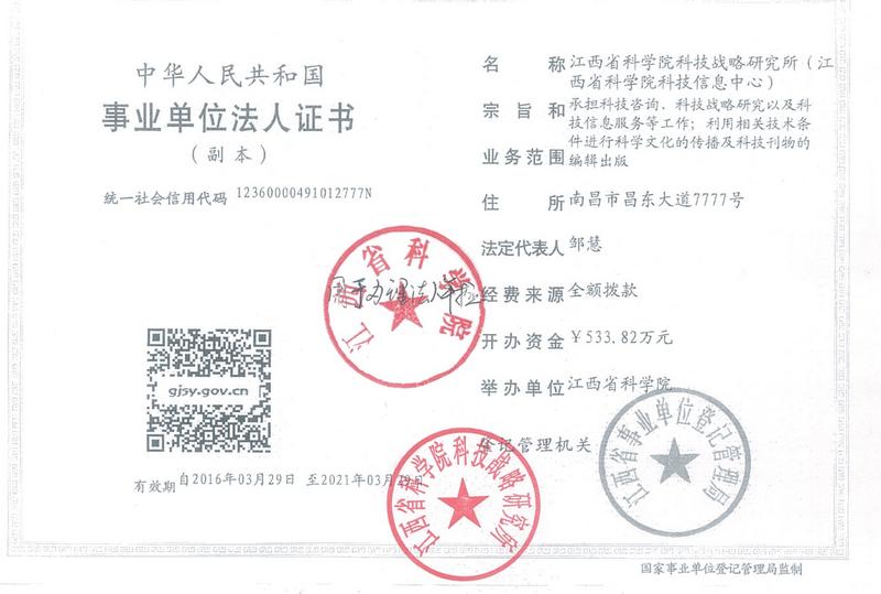江西省科公司科技战略研究所,是江西省科公司直属的社会公益类科研机构,主要承担科技决策咨询、科技战略研究以及科技信息服务等工作,拥有权威数据库和专业分析软件及专业培训的研究人员,是全省首个集科技战略研究、科技文献服务、科技信息检索与科技决策咨询为一体的科技战略研究所。拥有国家级平台1个:“国家知识产权分析评议示范机构”;省级平台3个:“江西省科技发展战略软科学研究基地”、“江西省知识产权服务品牌机构”、与南昌大学共建“研究生联合培养基地”;与中科院文献情报中心共建平台3个:“产业情报研究中心”、“文献信息共享服务站”、“中科院文献情报中心江西查新工作站” 。