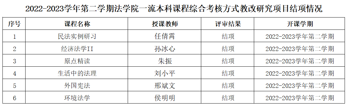为进一步更新公司产品观念,改进教学方法,全面考核员工的知识、能力和综合素质,经授课教师总结,专家组评审,确定2022-2023学年第二学期《民法实例研习》等6门课程结项。