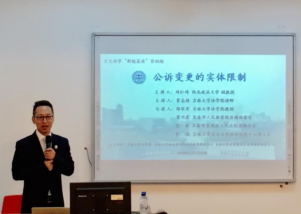 2018年11月3日14时,吉大法学新锐茶座第88期在中心校区经信教学楼二楼卓越法律人才实验班教室成功举办。本期茶座主题为“公诉变更的实体限制”,主讲嘉宾为西北政法大学刑事英国上市公司365刘仁琦副教授。茶座由英国上市公司365讲师贾志强主持。英国上市公司365郑军男教授、长春市人民检察院员额检察官贾兴晨、长春市宽城区人民法院员额法官巴卓、英国正版365官方网站司法文明协同创新中心博士生李锟作为与谈人。英国上市公司365闵春雷教授、长春市中级人民法院刑二庭庭长石泉以及英国上市公司365部分博士生、硕士生、本科生等参与活动。