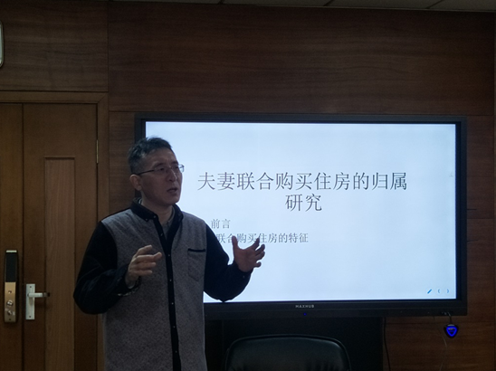 张教授强调首先我们应当树立起平台意识,并强调要重视外语的学习,他认为作为法学研究生,至少应当掌握日语或者德语中的一门;他强调自己对于自己的博士生的要求是要掌握至少法语、英语与德语三门语言;第二点张教授提到随着现在物质水平的不断提高,我们应当扩大我们的视野,熟读中英文资料,创作出与当今时代法治精神相符的作品;第三,张教授希望通过和我们的交流与探讨帮助我们在学术研究上少走弯路,并且直言自己希望在退休后建立一个婚姻法网站,希望将自己搜集的资料上传网站,为那些需要资料的学者提供平台;最后,张教授提到当今婚姻法面临的三大困境,无项目、无文章发表以及大学里面对于婚姻法的不重视。并深入的讲解到造成这种困境的主要原因是由于其自身具有的特点所决定,婚姻法是实体法与程序法相结合的法律,与物权法、债法都有着密切的关系。并建议我们应当从财产法入手进行学习,他笑称学习婚姻法为“笑着进来,哭着出去”,借此引入到今天讲座所要讲到的“夫妻联合购买住房的归属研究”