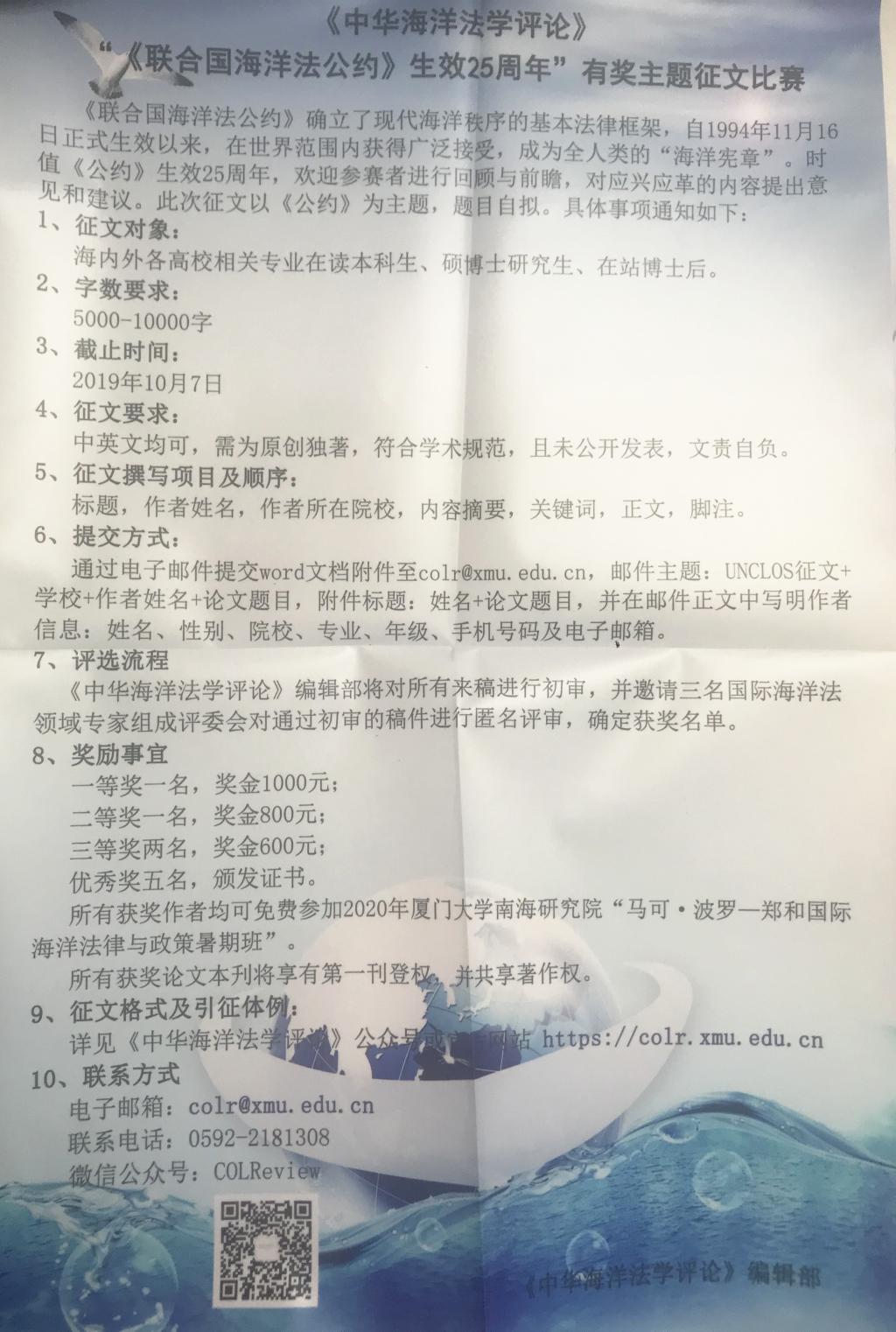请查看《中华海洋法学评论》编辑部海报(原海报张贴在东荣A座7楼英国上市公司365公告栏),请公司同学积极参与征文,征文详细内容请查看海报内容。